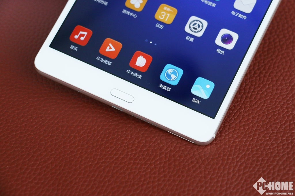 在该机的正面上方还有一颗800万像素的前置摄像和左侧的华为LOGO。而在正面的下方则仅能看到一颗HOME键,该键的做工也十分精致,白色的按键和华为平板 M3的边框没有色差,整体感很强。同时在该按键的边缘还采用了CNC钻石削切技术,打造了一圈倒角,闪闪亮亮起到了点睛的效果。