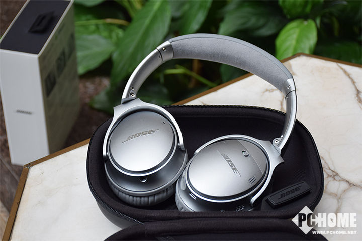Bose QC35在包装上延续了Bose一贯的设计风格,正面具有耳机的视图、型号等信息。BoseQC35目前提供了银色和黑色两种选择,银色款的Bose QC35在包装内提供了坚固的黑色收纳包,做工细致到位,打开收纳包后QC35耳机以及其他附件都在其中。Bose QC35耳机的耳罩被半圆形的框架所固定,头带和头部接触的部分被覆盖上了柔软的Alcantara面料,耳罩部分则是人造皮革,可舒适地包裹你的耳朵,同时创造一个良好的密封和噪音隔绝环境,符合人体工程学。