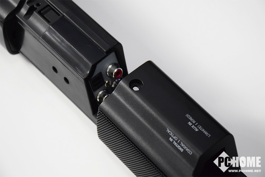 细长条的Soundbar秉承极简主义风格,正面覆盖有金属网罩,除了可以放置桌面外,还可以使用电视支架或挂置墙上进行聆听,左右两边各带有一个软球顶高音扬声器。5.25英寸低音炮摸起来有点像木质箱体,整体做工扎实。背面有低音炮上常见的倒相孔,筒形的倒相孔使箱体内外的空气沟通,形成良好的低频效果。低音炮无需连接音频线就能接收到主机型号,平时使用只要连接电源完全可以随意摆放。