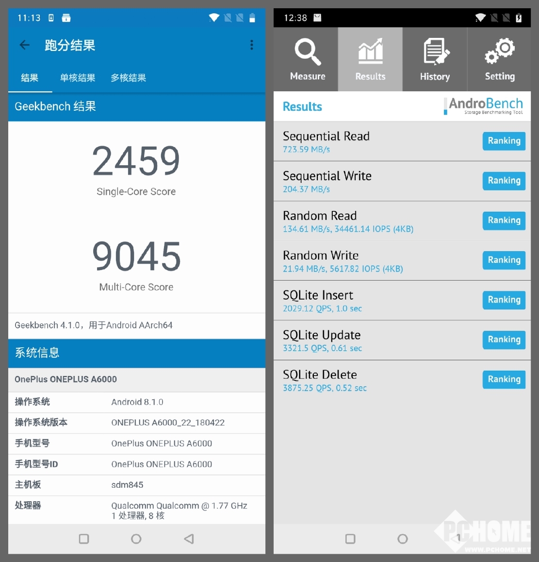 在硬件配置方面,一加手机6拥有目前安卓手机最顶级的配置,处理器采用了高通骁龙845移动平台,骁龙845采用了10nm工艺制程,八核Kryo 385CPU,64位架构,GPU为Adreno 630,作为今年旗舰手机的新宠,高通骁龙845在性能上也提升明显。在一加手机6的Geekbench跑分中,单核2459分,多核为9045分。