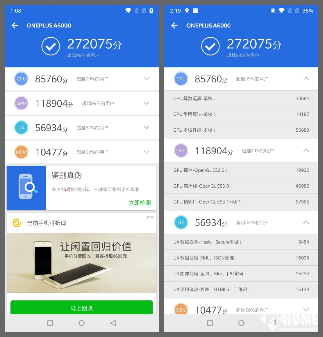 在内存方面,一加手机6共有三种内存配置,分别为6+64GB,8+128GB和8+256GB,小编手机的是8+128GB,在安兔兔中跑分为272075分,在安卓手机中基本上已经登顶了。