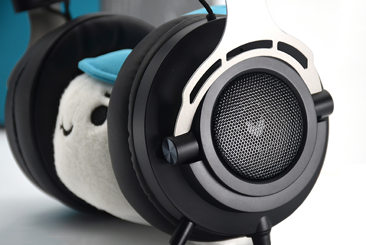 这款耳机梁架转轴的开合角度略有些小,但佩戴后耳罩能够贴合绝大多数玩家的脸型,实用性还是很不错的。转轴表面的高密度CD纹路很有质感,同时镂空式的梁架设计让耳机看上去不会显得臃肿。