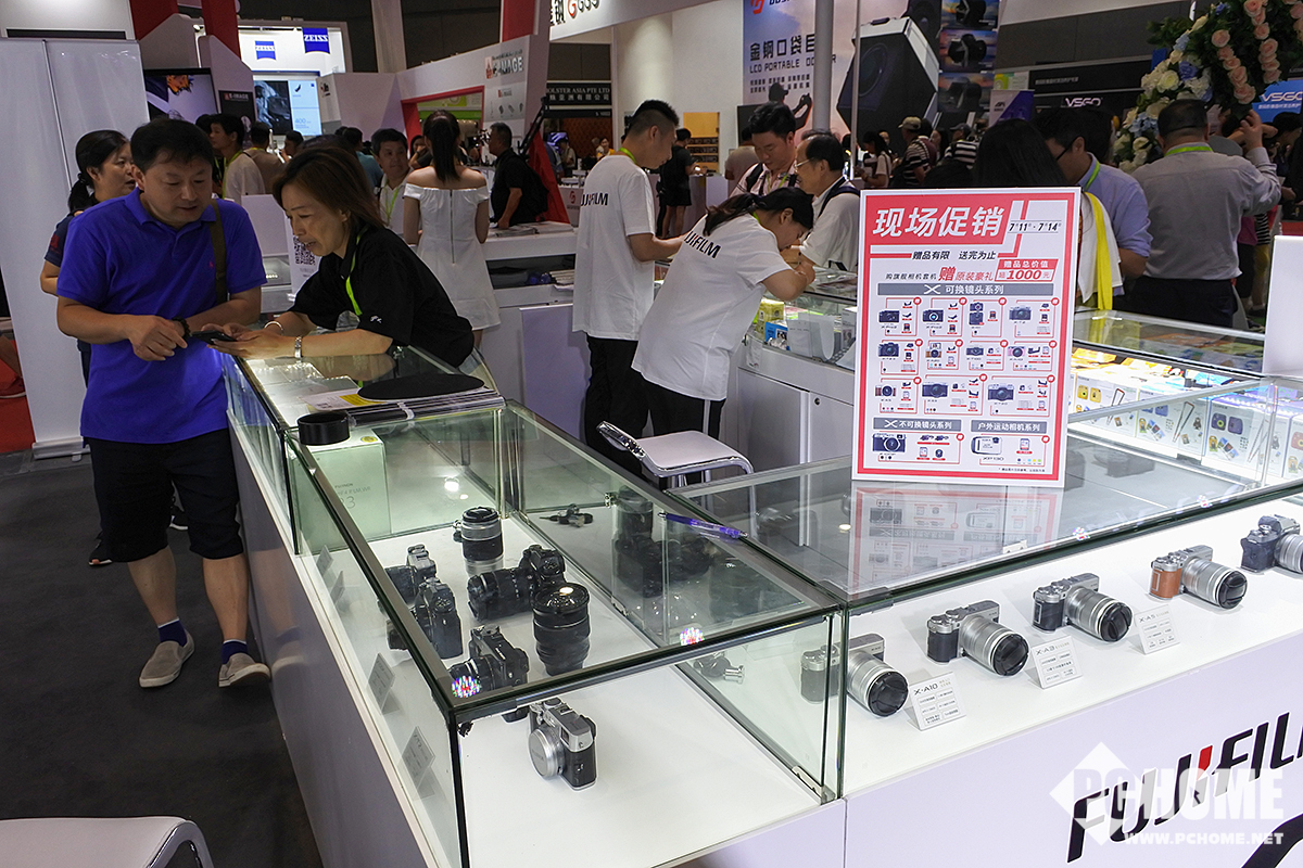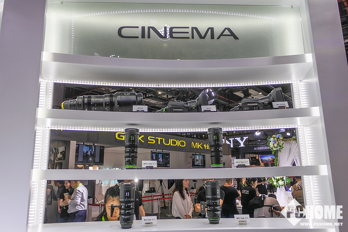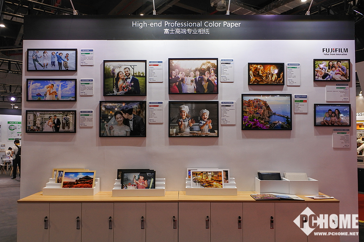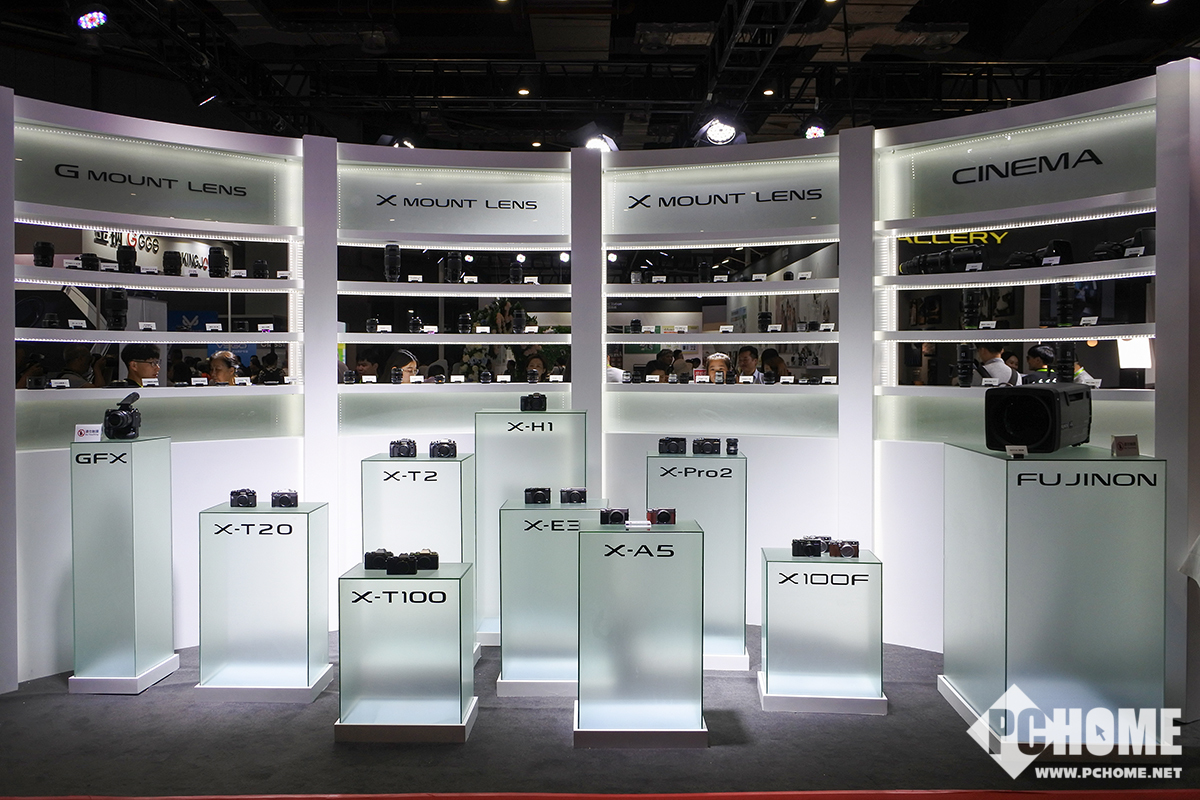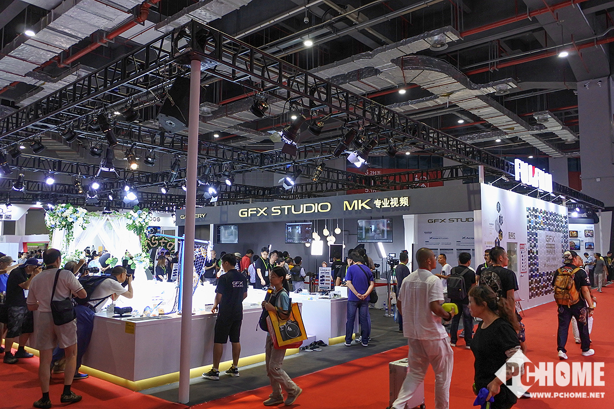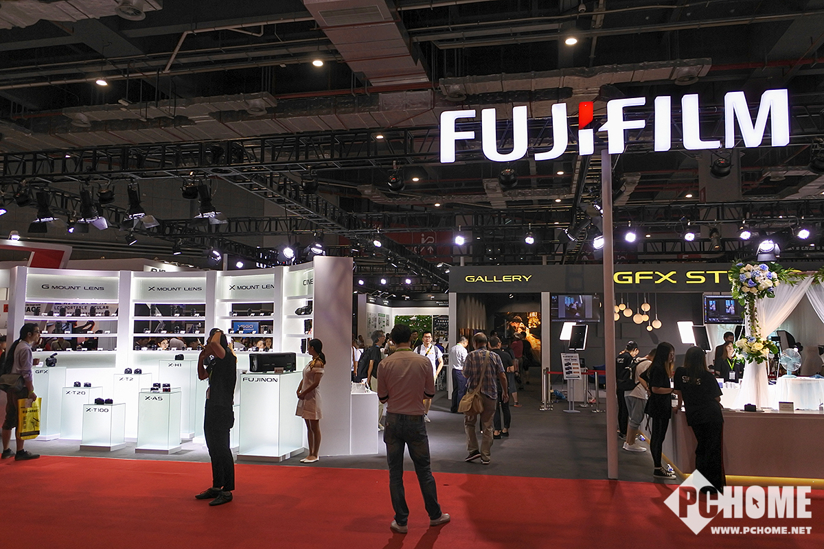 四大展商均集中在展馆的中心区域,呈四方布局。富士展台在这个四方布局东北,整个展台更方正,也比较大。从展区布置来看,富士的产品阵列更加立体,其中有GFX中画幅系统,也有富士龙CINEMA电影镜头。人像拍摄区富士也安排的和别家稍有不同,延续了以往的风格,除了围绕产品体验的公共区域,还有专门用于体验GFX中画幅和MK专业视频的特别区域。画廊也是富士的一大特色,这也和富士是胶片企业出身有很大的关系。偌大的富士展台,除了富士数码相机以外,一次成像instax和专业打印输出也占据了主要的位置,为喜欢富士胶片的用户带来了不同的观展感受。