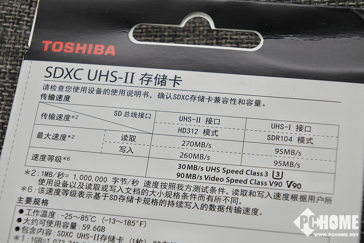 【PChome影像行摄频道——评测室】东芝极至超速EXCERIA PRO SDHC/SDXC存储卡,型号N502,是目前东芝SD存储卡中的旗舰产品。该卡采用UHS-II高速接口,拥有最高270MB/s读取速度和最高260MB/s的写入速度,并且满足U3和V90速度等级,尤其是视频上,可以达到V90定义的90MB/s持续写入速度,支持8K视频的拍摄。N502产地日本,提供四种容量版本,分别为256GB、128GB、64GB、32GB,并且附赠1年的数据恢复软件免费使用权限,此次送测的为64GB版本,目前市场售价599元。