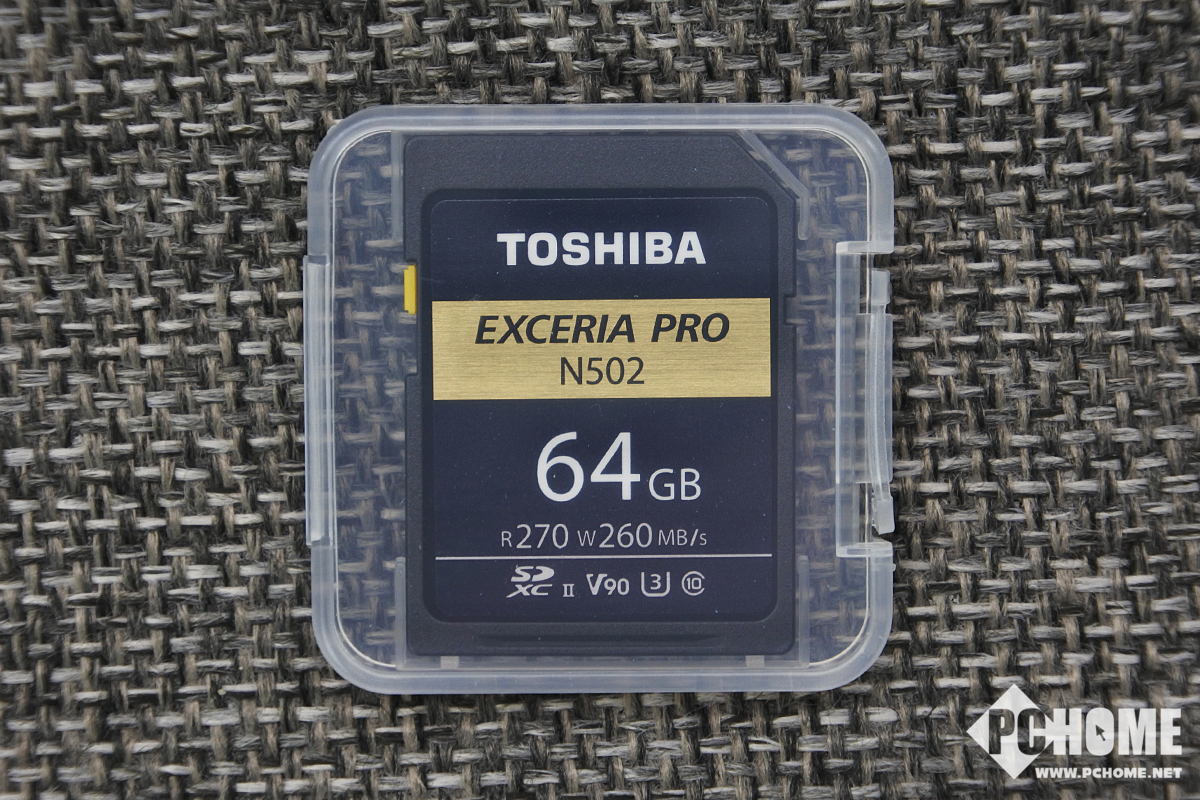 【PChome影像行摄频道——评测室】东芝极至超速EXCERIA PRO SDHC/SDXC存储卡,型号N502,是目前东芝SD存储卡中的旗舰产品。该卡采用UHS-II高速接口,拥有最高270MB/s读取速度和最高260MB/s的写入速度,并且满足U3和V90速度等级,尤其是视频上,可以达到V90定义的90MB/s持续写入速度,支持8K视频的拍摄。N502产地日本,提供四种容量版本,分别为256GB、128GB、64GB、32GB,并且附赠1年的数据恢复软件免费使用权限,此次送测的为64GB版本,目前市场售价599元。