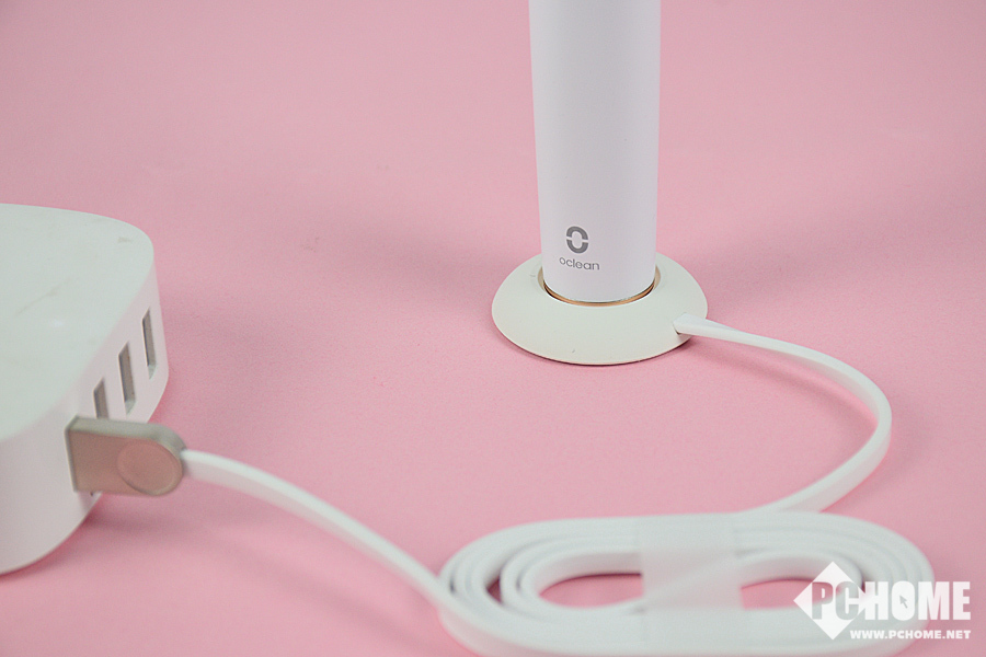 值得一提的是,Oclean Air智能牙刷采用了更加简单直接的接触式充电方式。在保证智能牙刷的深度防水的基础上,充电底座的电极直接跟智能牙刷底部的镀金环直接接触,这样做最大的好处就是充电电流比较大,能够在很短的时间之内把电池充满,仅2小时充满,支持最高30天续航时间。充电底座还具备自动吸合功能,只要把牙刷底部靠近底座,便能自动吸合在一起。