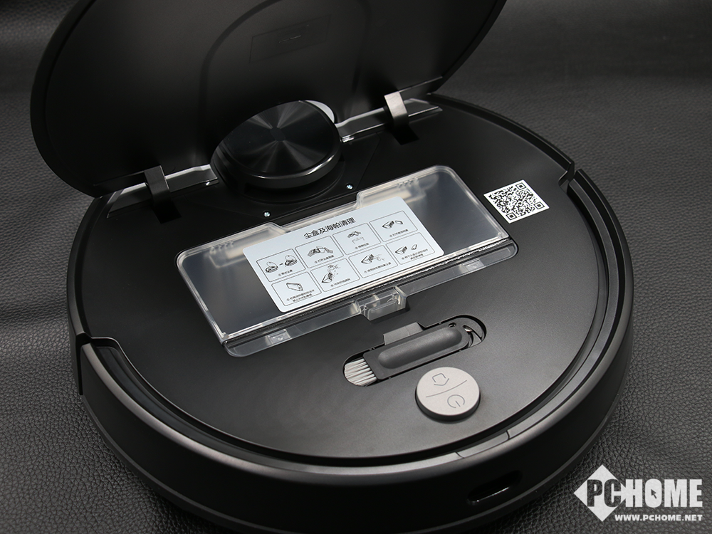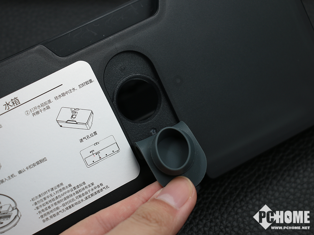 浦桑尼克M7的正面灰色部分分为两段式设计,面积较大的这一边可以直接翻开,里边就是灰尘盒的槽位。将灰尘盒取出后也可以直接放入一个500ml的水箱,在拖地模式时可以使用。