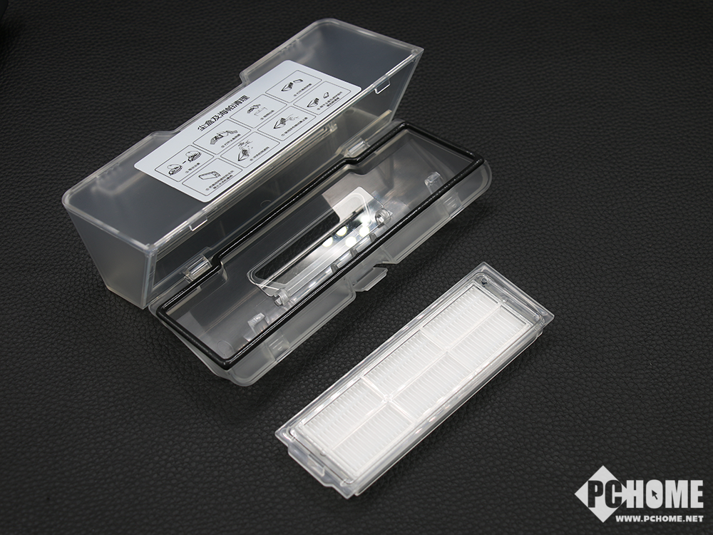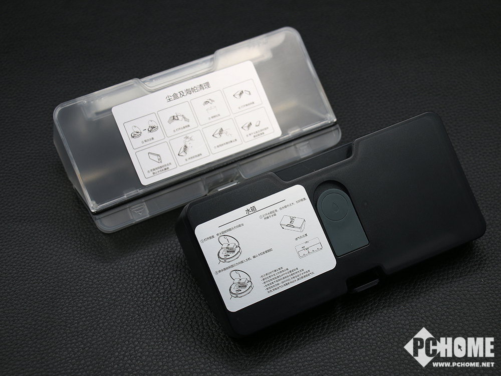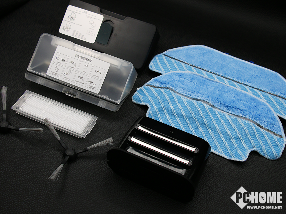 在包装内,浦桑尼克M7的主要配件除了灰尘盒和水箱之外,还赠送了一枚灰尘盒使用的背部吸尘海帕、一套抹布以及两个边刷,提供了非常充足的清洁替换可能。