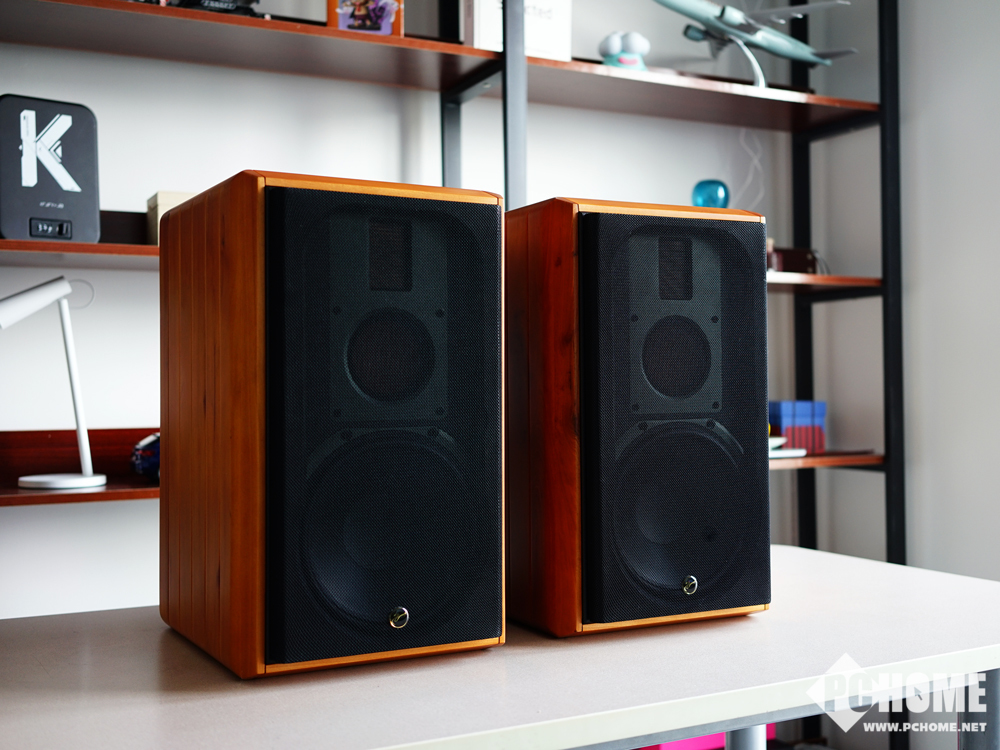 惯例还是先来看看外观,惠威M5A的外观绝对可以用雍容大气来形容了,外壳部分的实木材质以及正面的纤维滤网搭配在一起让音箱整体更具古典气质,同时外层实木也可以在发声的时候实现更好的共振和声音反弹。