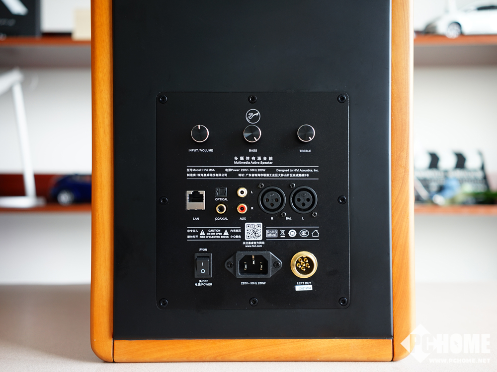 翻到背部,主音箱背后拥有非常全面的音频输入输出端口,包括有同轴、线路、平衡、WLAN等输入模式,同时惠威M5A还支持蓝牙以及WiFi的链接,可以与家里的终端设备进行联动,蓝牙5.0的传输速率也使得声音在传输的过程中不会受到过多地干扰,保证音源的传输纯净。