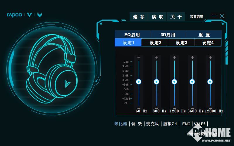 主页面包括四组自定义EQ设置,并可存储与读取自定义配置,实现3D环绕效果启动及关闭。下方可切换等化器、音效、麦克风、虚拟7.1、ENC、VM Eff等功能,软件的UI及操作逻辑比较简单,比较容易上手。