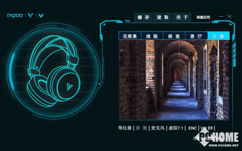 雷柏音频驱动中预置了四种不同的环境仿真音效,包含戏院、浴室、客厅和石廊等,用户可以根据个人喜好或者不同游戏风格进行自定义切换。