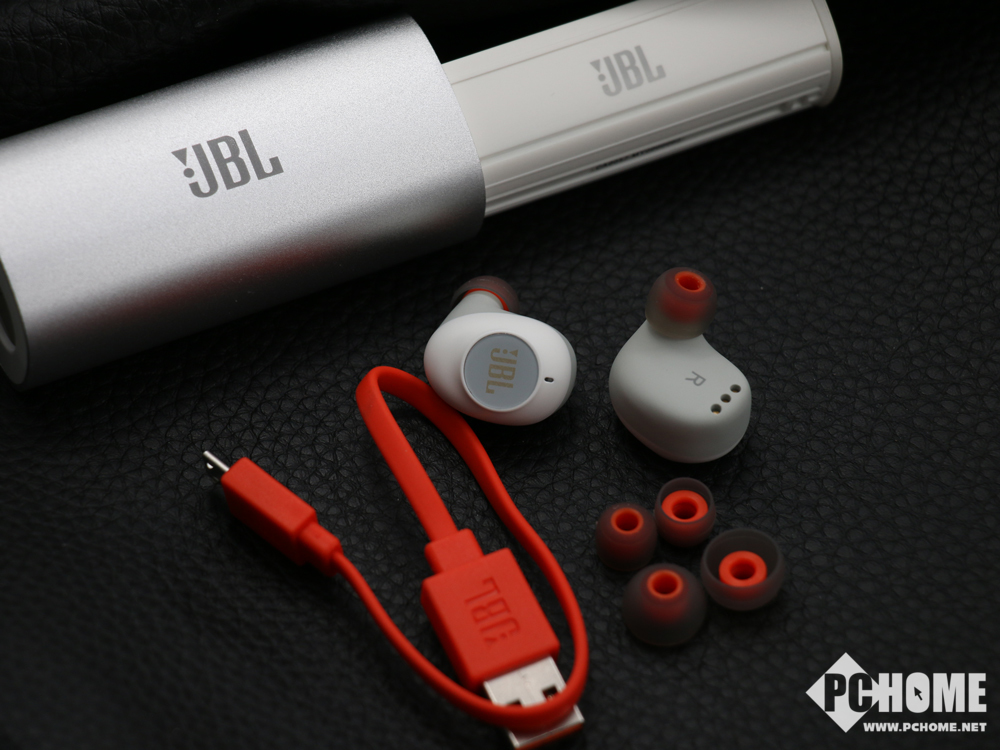 配件部分随包装一起的只有两个不同尺寸的硅胶套和一根极具JBL特色的橙色充电线。