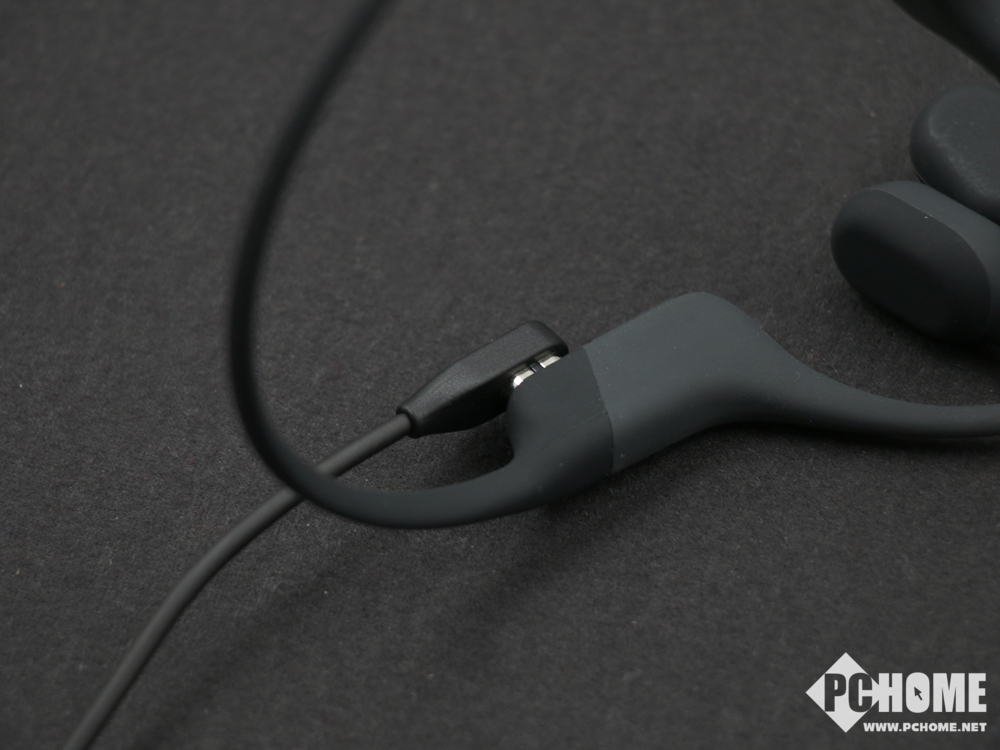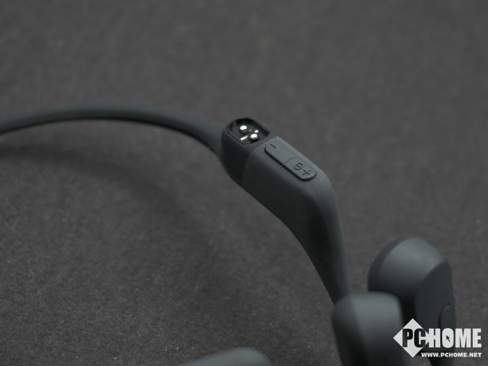Aeropex的右侧操控区域部分集成了电源键、音量调节以及接触式充电触点,金属触点的充电部分也值得一提,因为Aeropex本身支持IP67级别防尘防水,如果采用一般的USB接口充电的话,势必会造型意外接触到水滴发生意外,但金属触点式充电却可以很好的避免这一点,即便有水分残留也可以很方便的擦干净,继续充电。