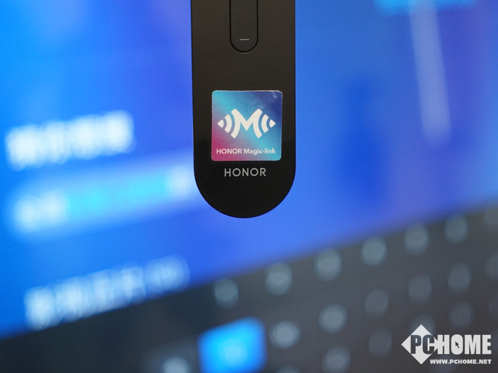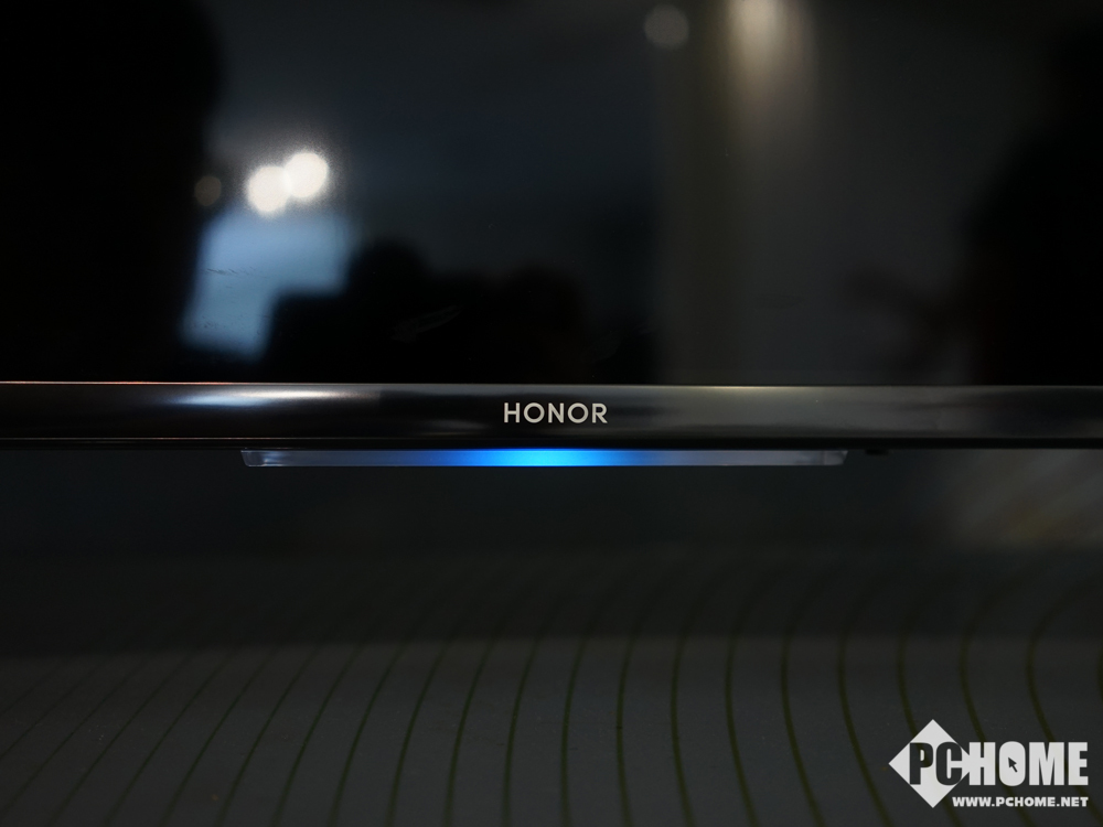 智慧屏的底边框中央位置是荣耀的英文logo,在logo底部的位置其实是有一个呼吸灯存在的,当智慧屏处在熄屏的时候会泛起蓝色的晕光,后续也将在不同功能下增加不同的颜色灯光,起到提示的作用。