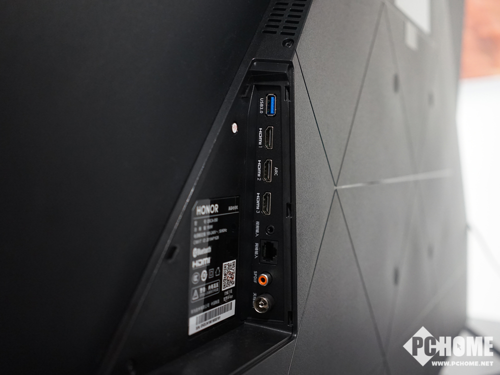 荣耀智慧屏的侧边看上去非常的纤薄,官方数据显示最纤薄部分仅有6.9mm的厚度。而背部的侧边还有全规格的外接端口,可以满足消费者的全场景扩展需求。荣耀智慧屏配备了三个HDMI 2.0接口,中间的支持ARC音频回传,方便接功放、游戏机等设备。