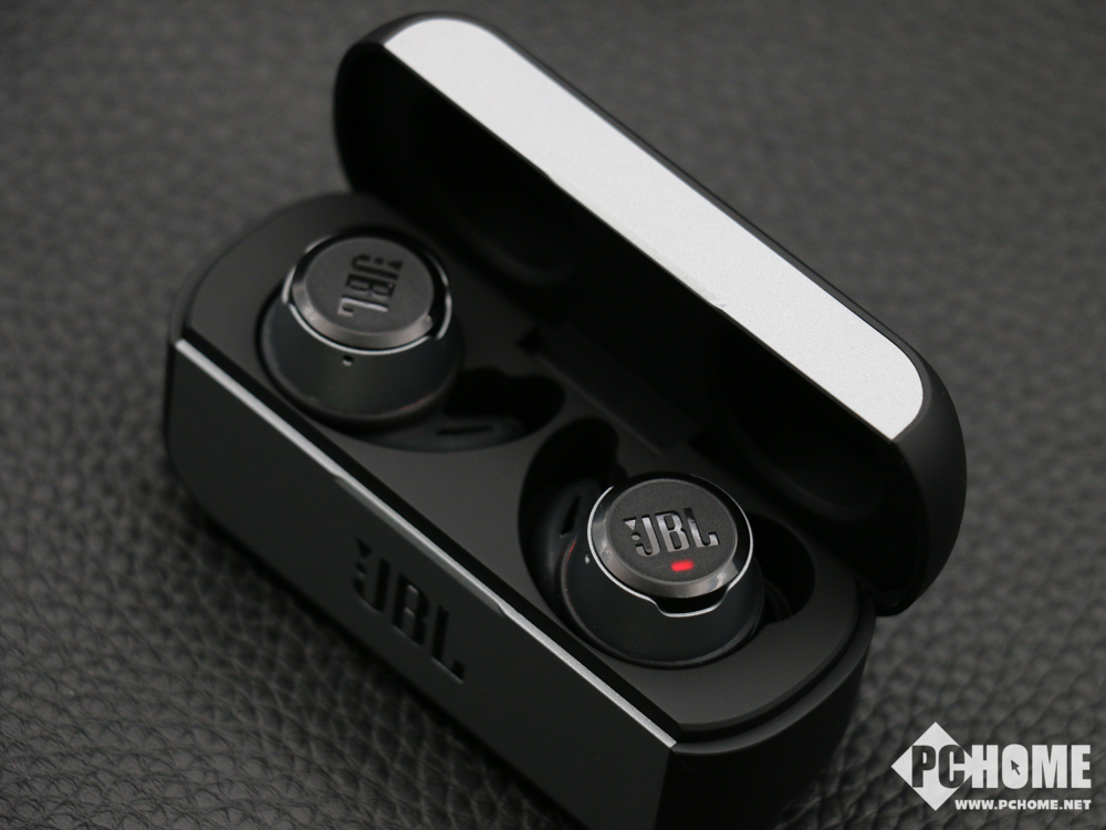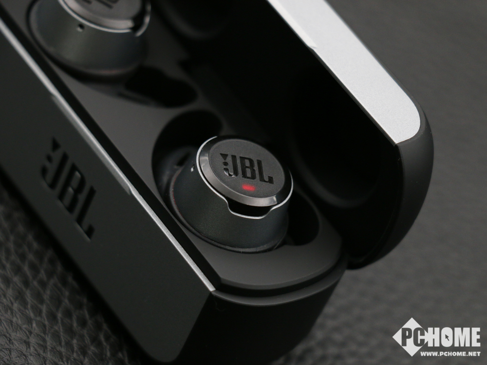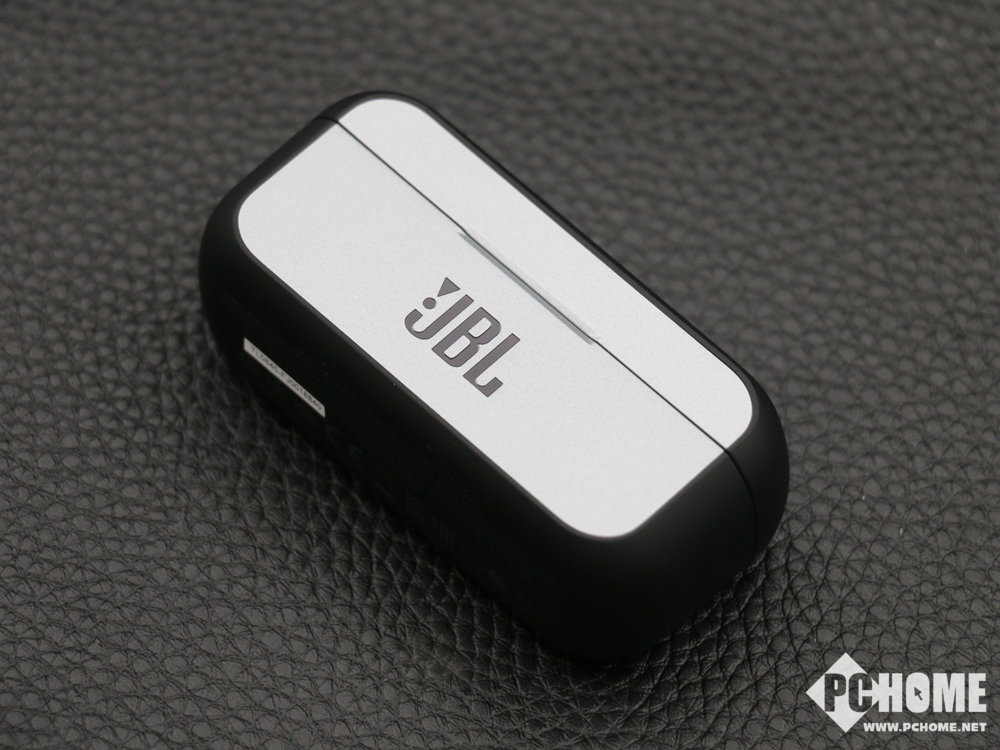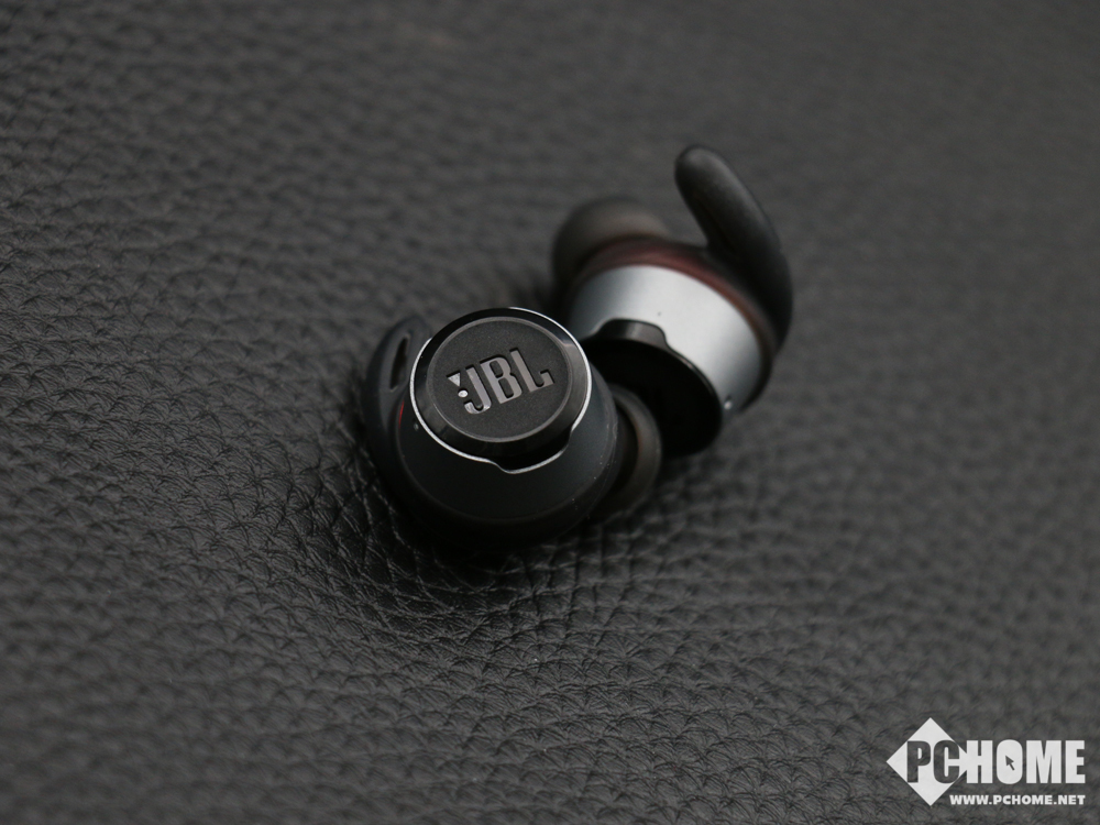 我们拿到的这款黑色在外层采用了灰色的金属色,触控区域则是黑色磨砂质感,“JBL”的logo也采用了反光的设计,稍微倾转一下就会产生高光的效果。