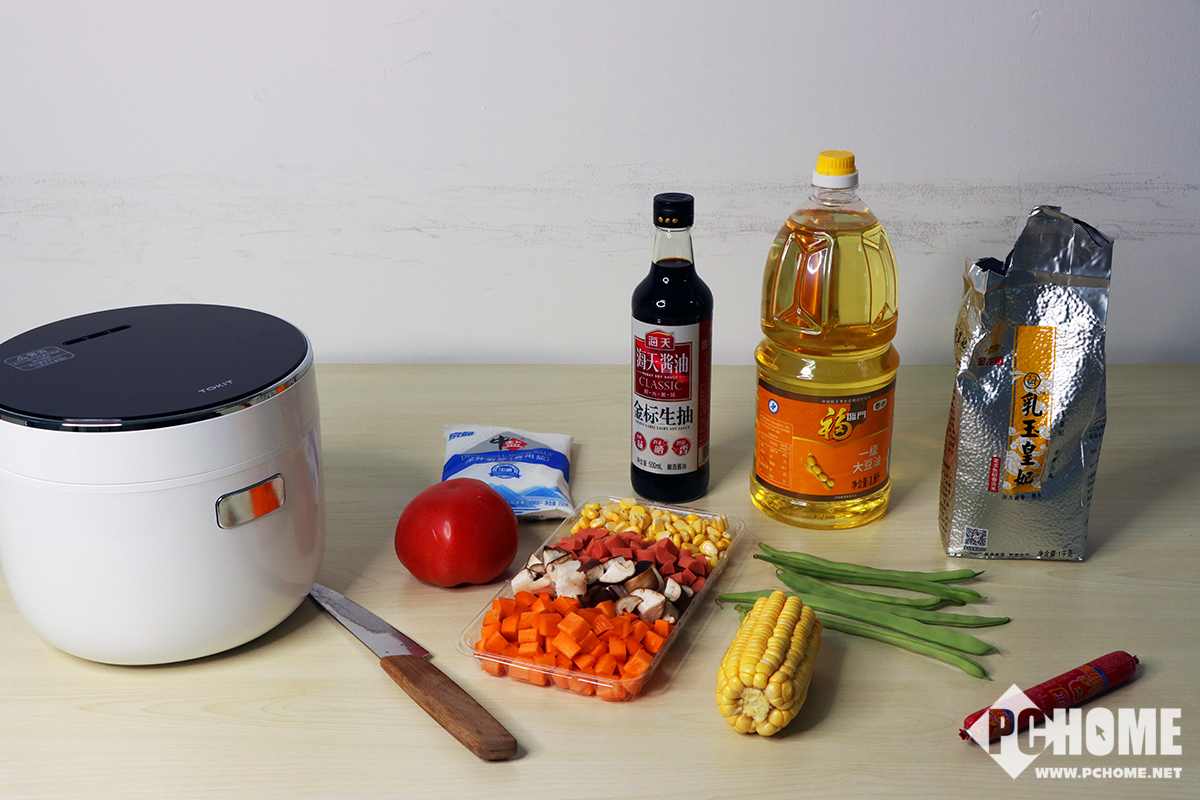 TOKIT迷你智能电饭煲、一个西红柿、两杯米、两杯水、一根胡萝卜、一根火腿肠、两朵香菇、一个土豆、半根玉米、盐、老抽、食用油。