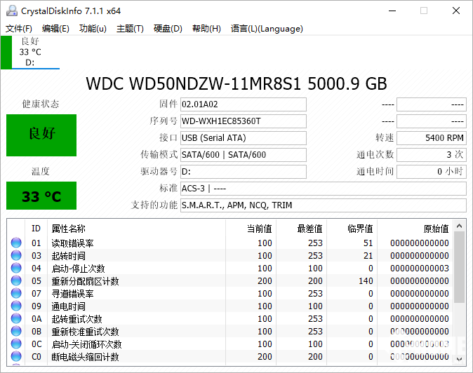 通过CrystalDiskInfo硬盘检测工具,我们可以看到WD My Passport 5TB的详细信息,包括接口、转速、温度、通电时间等,该硬盘支持SATA 3传输,转速5400/每分钟。基准性能部分,我们使用ATTO Disk Benchmark和HD Tune来进行测试。
