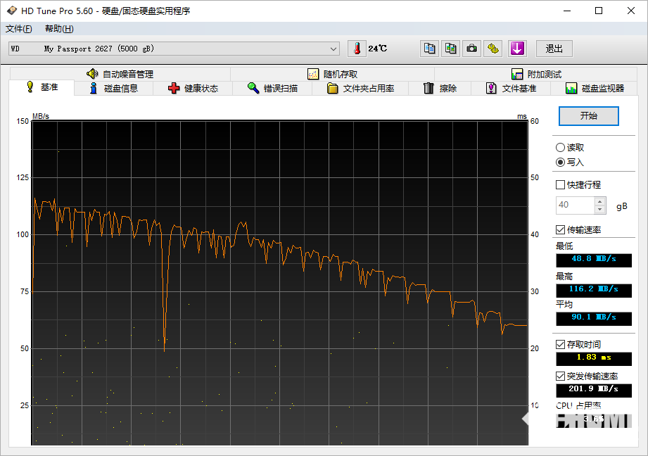 在HD Tune 专业版的测试中,WD My Passport 5TB的平均读取速度为96.6 MB/s,其中最高速度达到170.9 MB/s,存取时间为16.7ms;平均写入速度为90.1MB/s,其中最高速度为116.2 MB/s,存取时间为1.83ms,整体表现还是不错的。