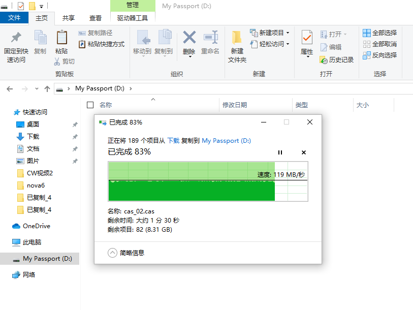 实际传输速度方面,我们向WD My Passport 5TB中拷贝了一个大小约为50 GB的文件夹,内含多种文件类型,源数据存储在一块SSD中。通过测试结果我们可以看出,WD My Passport 5TB在写入文件时表现还是非常出色的,平均写入速度为119 MB/s,全部拷贝完成用时8分10秒。