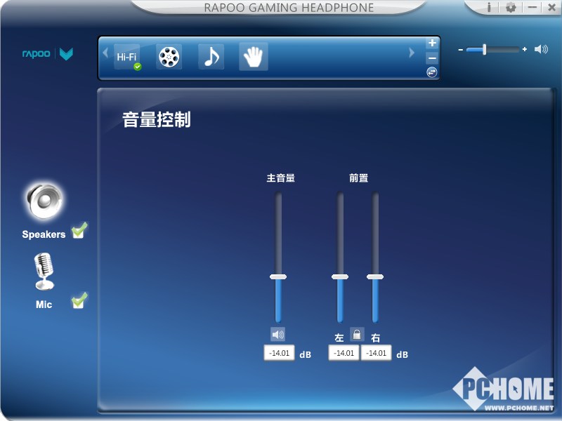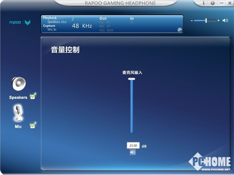这套专属的驱动页面颇有一丝科幻风格,蓝色的主界面清新简约。在主页面左侧可以切换扬声器或麦克风的音量调节,上方窗口为当前耳机的状态,点击切换按钮可以进入音效管理界面。软件的UI及操作逻辑比较简单,比较容易上手。