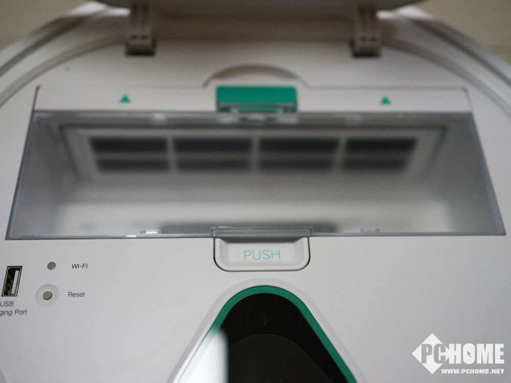 打开Trifo MAX的上盖之后,可以看到一个大容量的尘盒,这枚尘盒通过按压PUSH按钮取出尘盒,相比与传统的扫地器解除卡扣来说要方便一些。