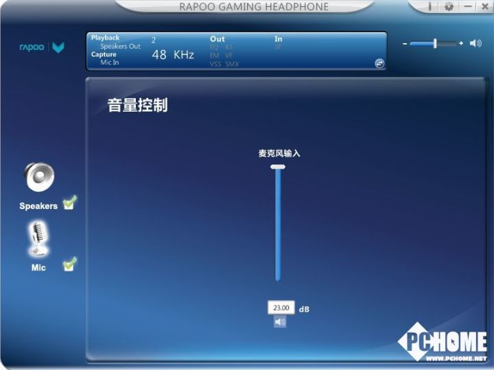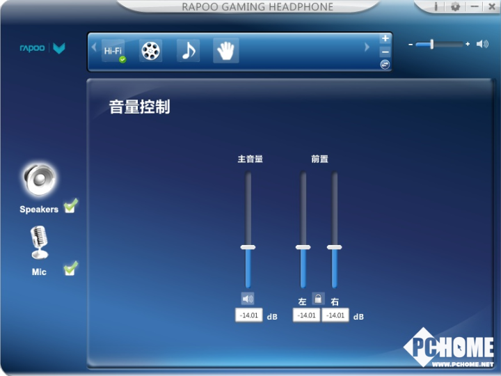 这套专属的驱动页面颇有一丝科幻风格,蓝色的主界面清新简约。在主页面左侧可以切换扬声器或麦克风的音量调节,上方窗口为当前耳机的状态,点击切换按钮可以进入音效管理界面。软件的UI及操作逻辑比较简单,比较容易上手。