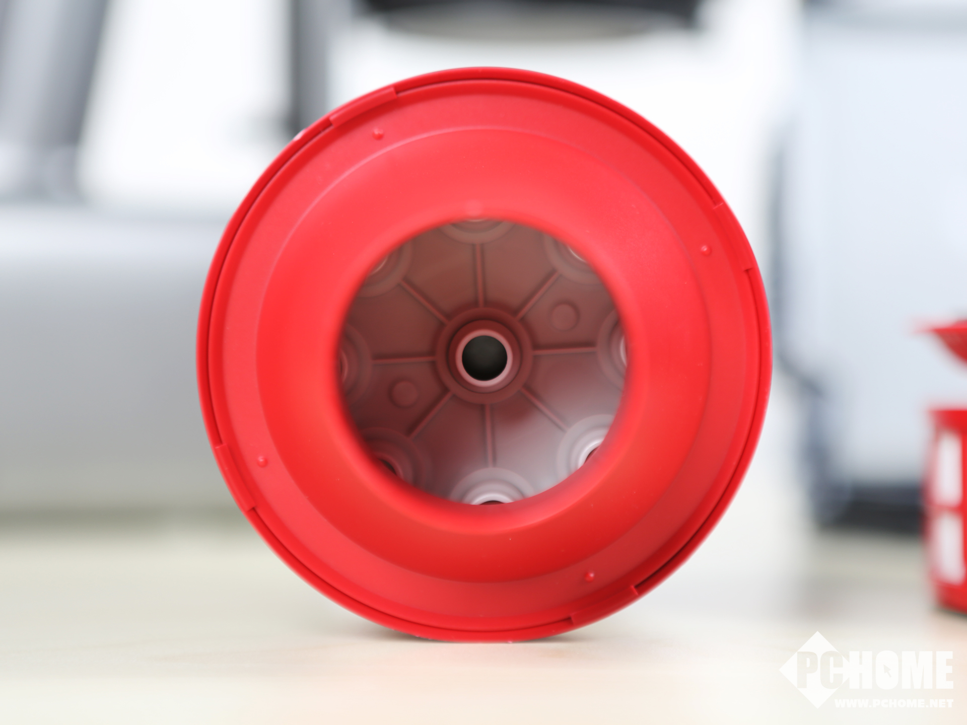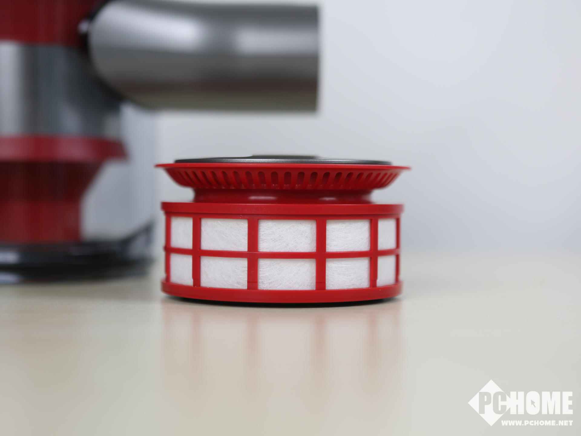 此外,H6还采用了多锥气旋分离技术,这一点我们从气旋杯中也可以明显看得出来九个锥形孔洞。通过特殊的结构让吸尘器的气流高速旋转,产生强大的离心力, 因为灰尘的密度要比空气大很多,在离心力的作用下就会沉降,从而与空气分离。这种方式分离的灰尘会 落到尘桶底部,不会堵塞滤网。常见的无线吸尘器都会利用圆柱形尘桶形成气旋,达到分离的目的。