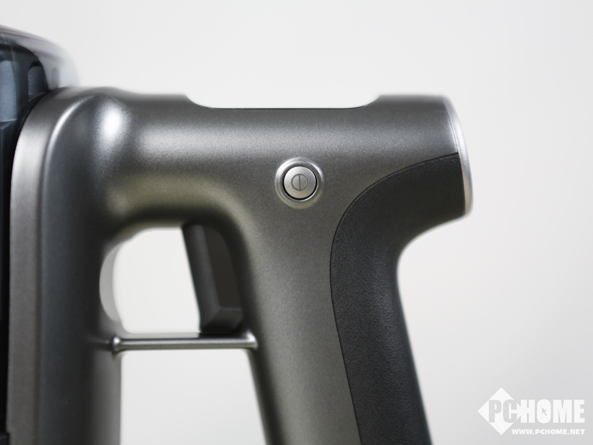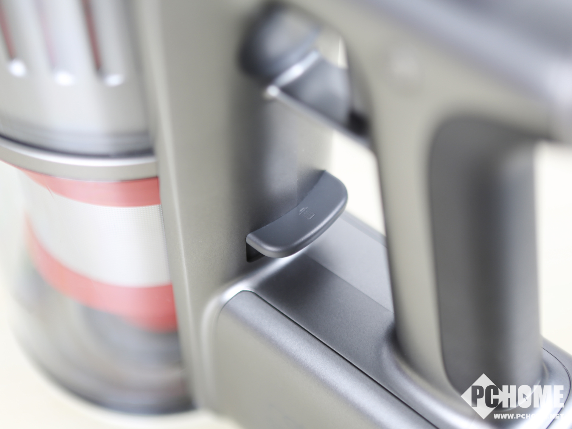 而机身的开关扳机则在食指和中指的位置,只需要轻轻的按动就可以发动电机进行吸尘。最后在手柄位置的前侧靠下的位置是一个可按压的按键,一定力度按压后即可打开尘盒,放出吸入的灰尘杂屑。