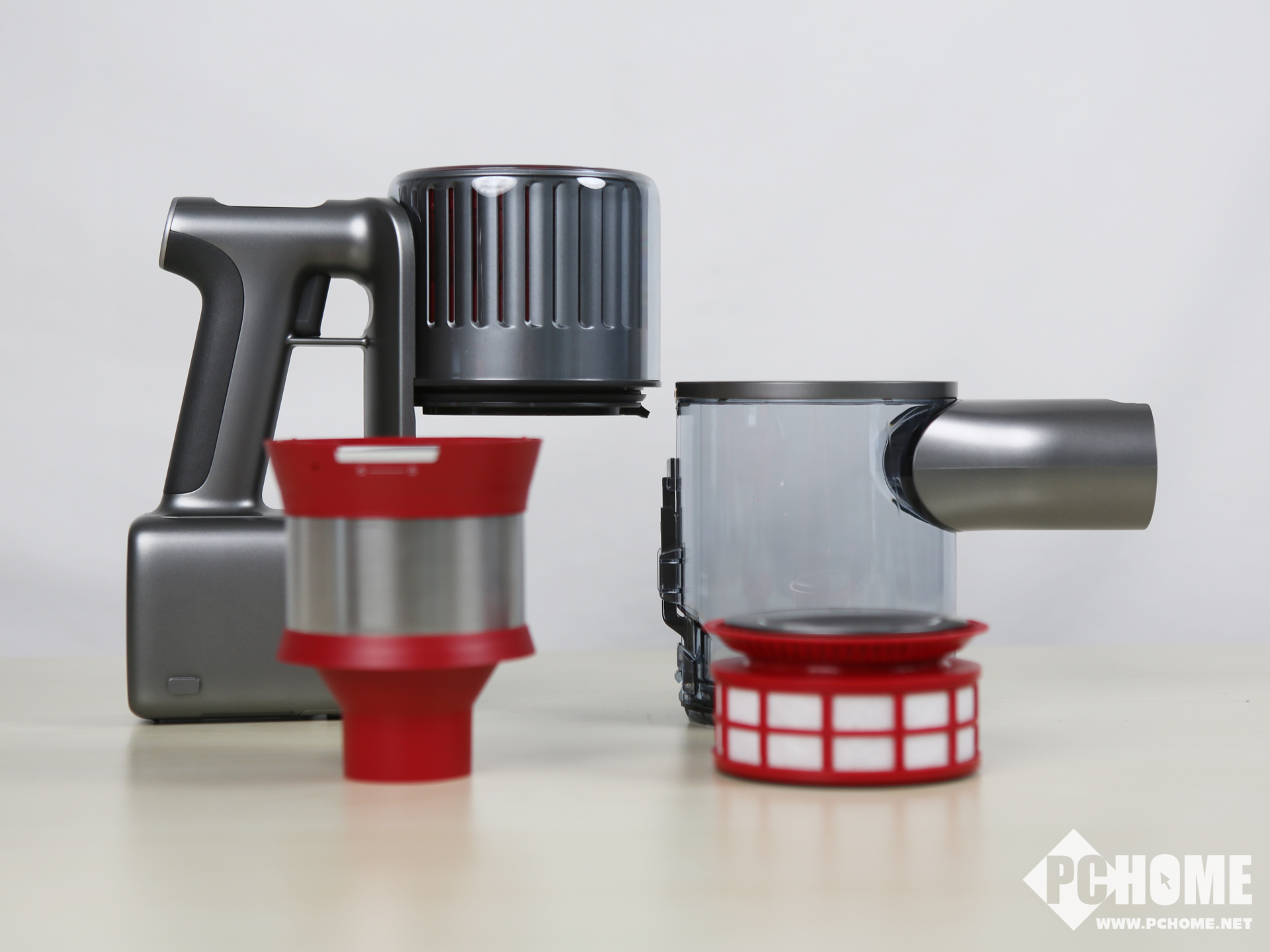 过滤区域从机器顶部旋拧打开,可以看到后置的HEPA滤网。而当我们从机身底部打开卡扣后就可以将尘盒的外层透明保护罩拿下来,借着旋拧就可以取下二级多锥气旋结构。尘盒这一部分是支持水洗清洁的,所以从整体的拆卸程度还是非常方便和便与清洁的,这一点要给出好评。