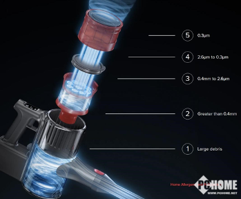 过滤系统方面,H6共有五层过滤,吸入的空气依次经过一级尘桶气旋,不锈钢初滤,二级多 锥气旋,内置过滤棉滤网和后置 HEPA 滤网,分别过滤不同直径的污染物。 对于小于0.3μm的胃颗粒物都可以进行有效的阻挡。