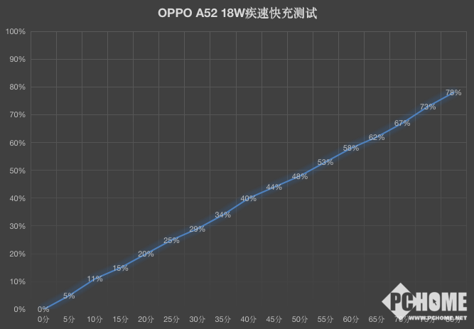 我们将OPPO A52的电量放光,进行充电测试,1小时充电58%。这个成绩乍一看比较一般,但乘以5000mAh就是2900mAh。要知道,一般的安卓手机也就是3000-3500mAh的电池容量。这个成绩基本与18W充电功率吻合,而且在充电过程中几乎感受不到明显发热。