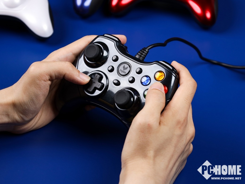 首先,我们使用该手柄体验了几款PC平台上的经典游戏,包括《战地5》、《彩虹六号:围攻》、《黑道圣徒4》等。PC平台的连接非常简单,插上USB接口即可免驱使用,通过X/D/A按钮可以切换至PC360手柄模式,此时RAPOO按钮的蓝色光环全部亮起。