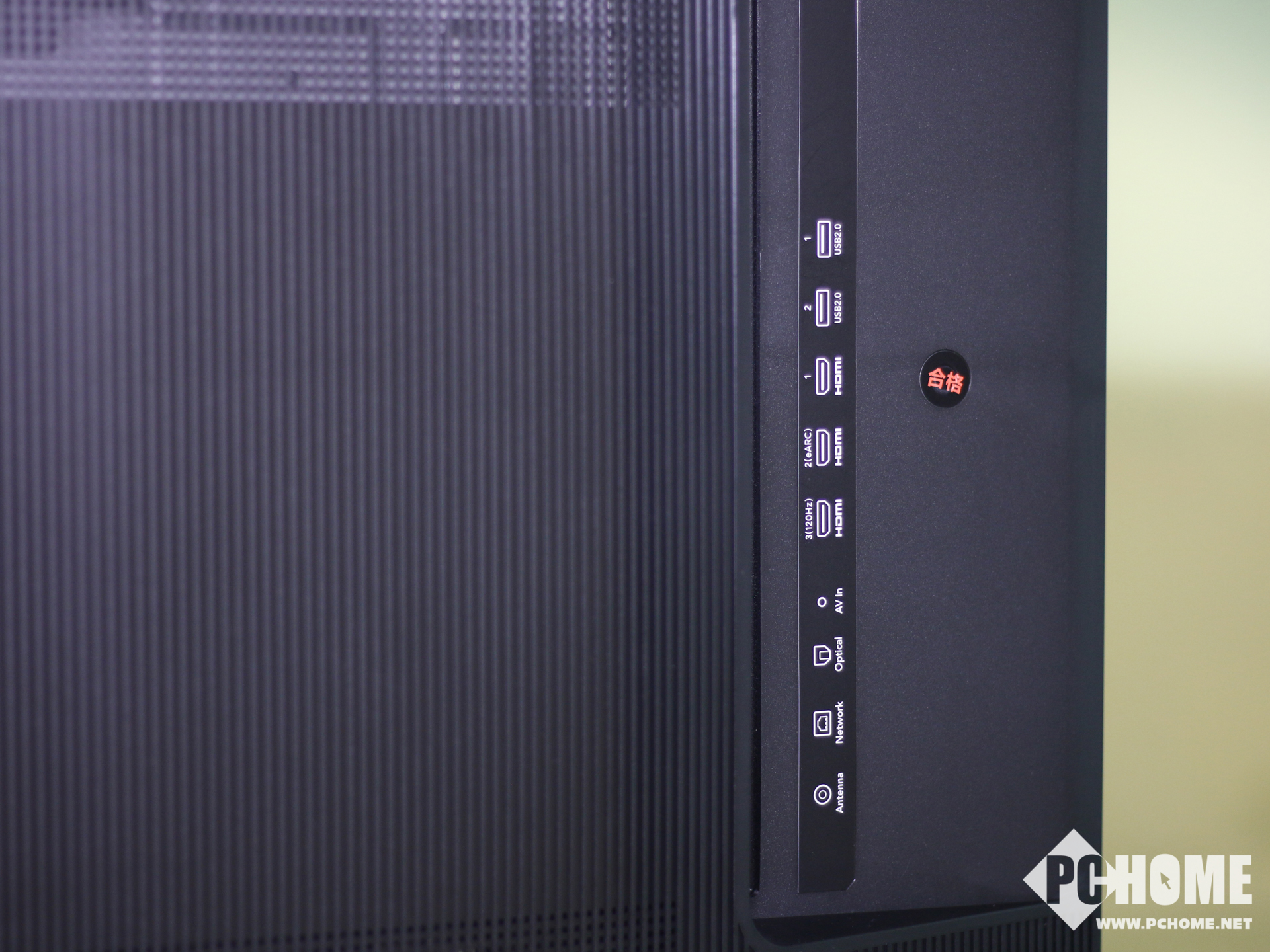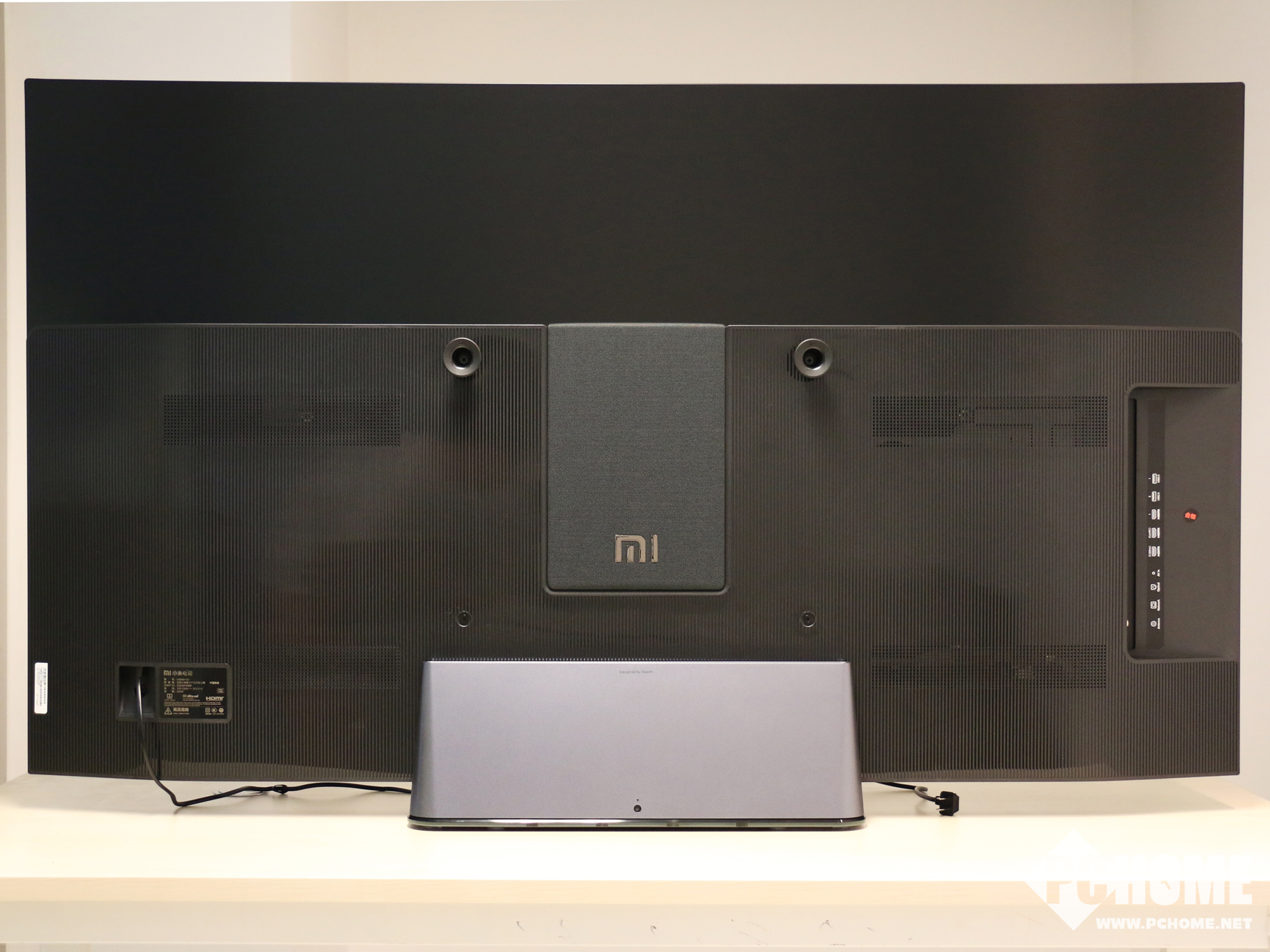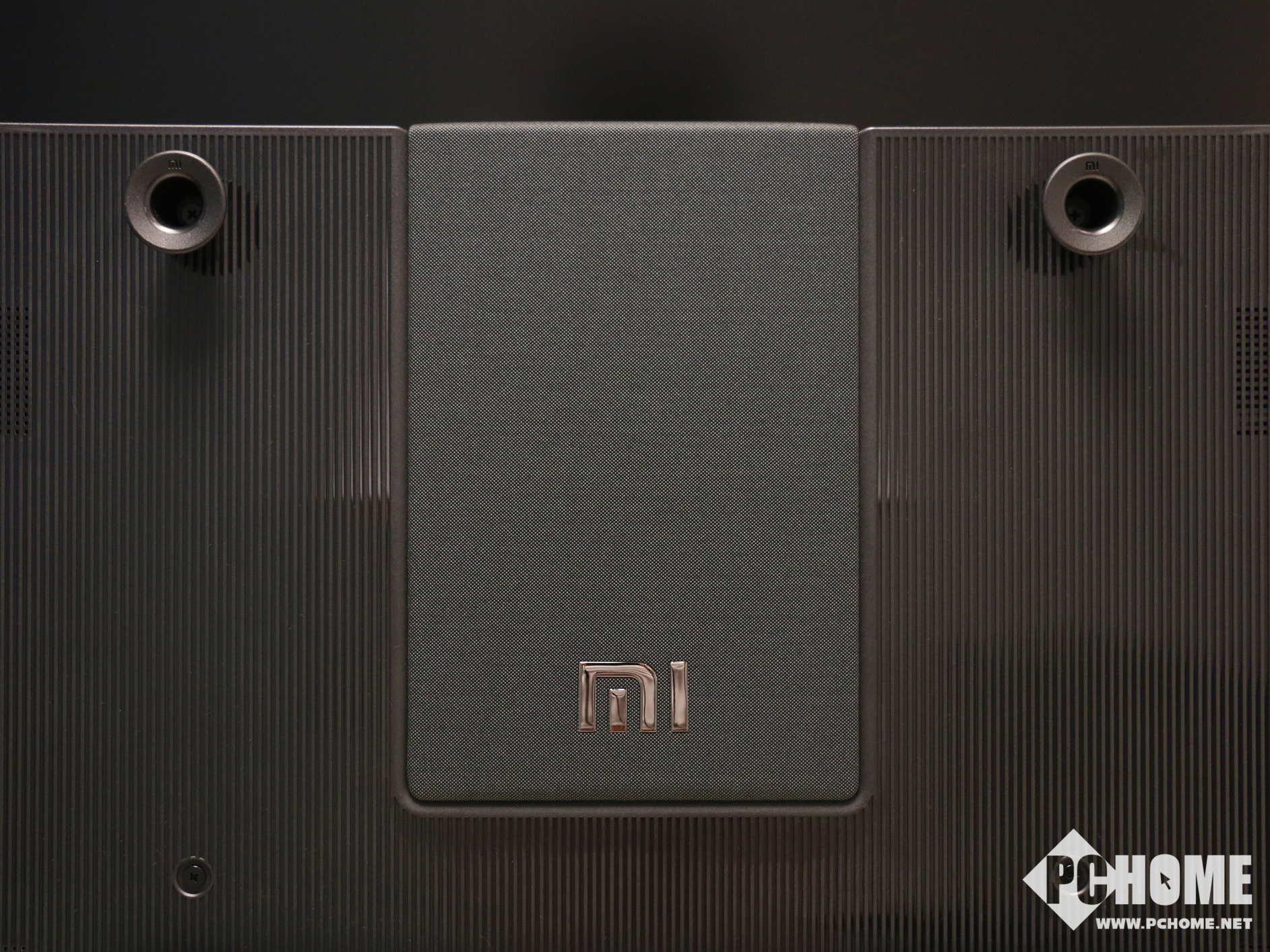 在背部中心位置有一个纤维布质的区域,这里其实是小米电视「大师」的无源辐射器所在,与背部下出的2组全频发声单元、背部上出的2个穹顶环绕扬声器和一个内置的1.9L超大音腔独立深潜低音炮一起组成了小米电视「大师」的3D全景声音响系统,这一点我们在后续的测试环节中也会详细介绍。