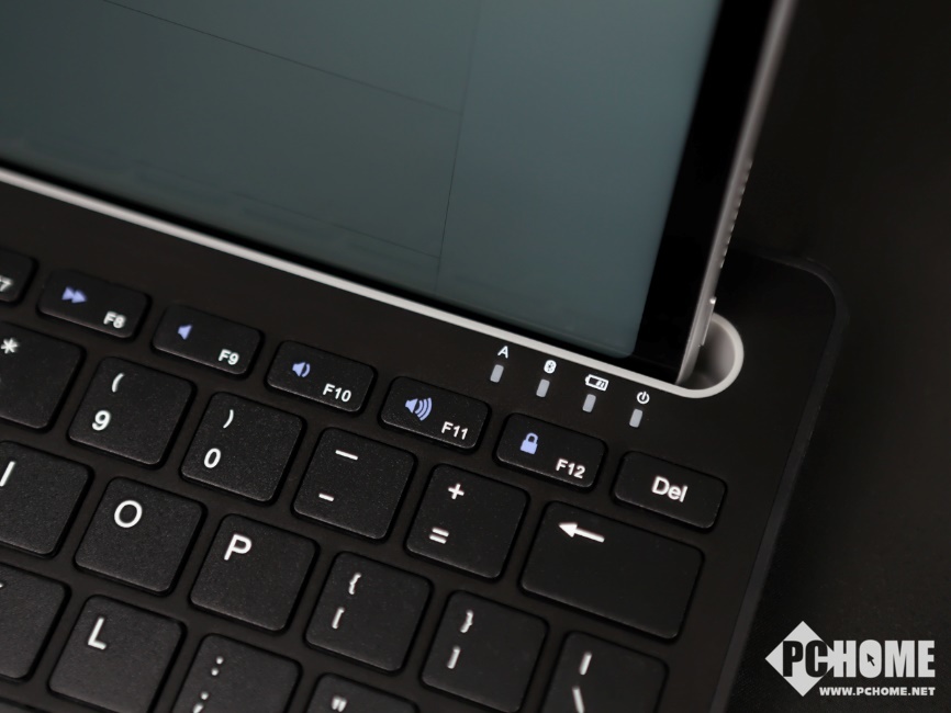 雷柏XK100自带卡槽,在连接平板、手机时,可以充当设备支架。一体式卡槽厚度约12.5mm,最大支持9.7英寸的iPad横向放置,大约110°的仰角,符合人机工程学,观看角度舒适自然。