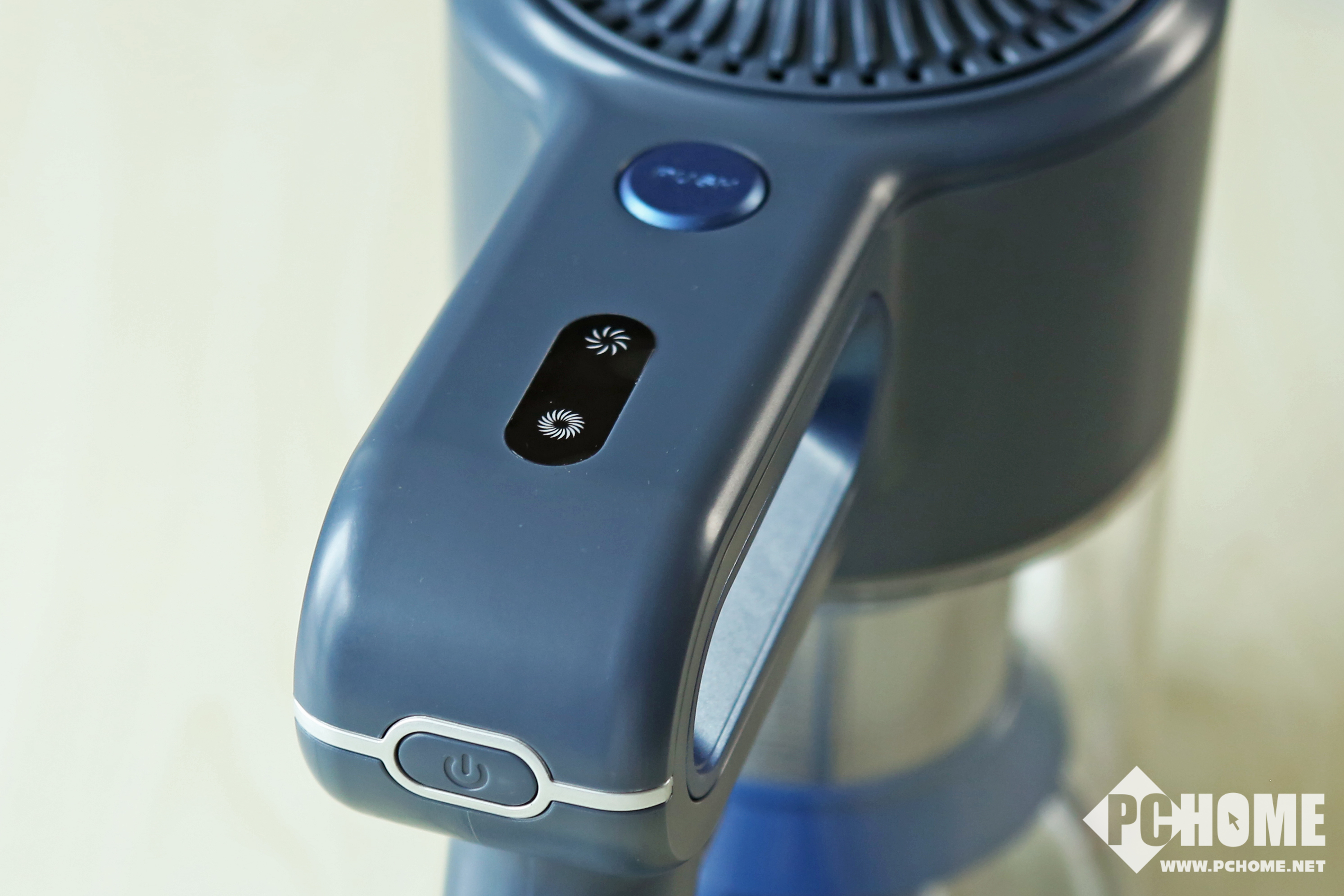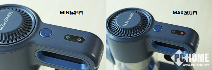 在主机上我们可以看到两个指示灯,标准档和强力档。除了档位指示灯,我们还可以在主机手柄下部发现充电指示灯,插入充电器后闪烁表示充电中,全部长亮则表示充满。在吸尘的过程中电量可视化,我们随时可以看见电量剩余量,利于我们规划充电时间。