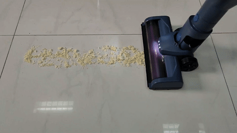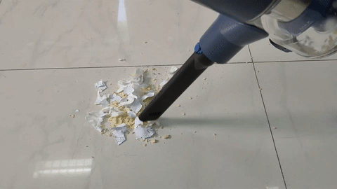 信社Z5无线吸尘器在吸尘的过程中可以释放约13500PA的吸力,对于一些碎屑、毛发、食物残渣等,信社Z5无线吸尘器吸力是够用的。小编将三块饼干掰碎放到地面,通过动图可以看到还是清扫的非常干净的。