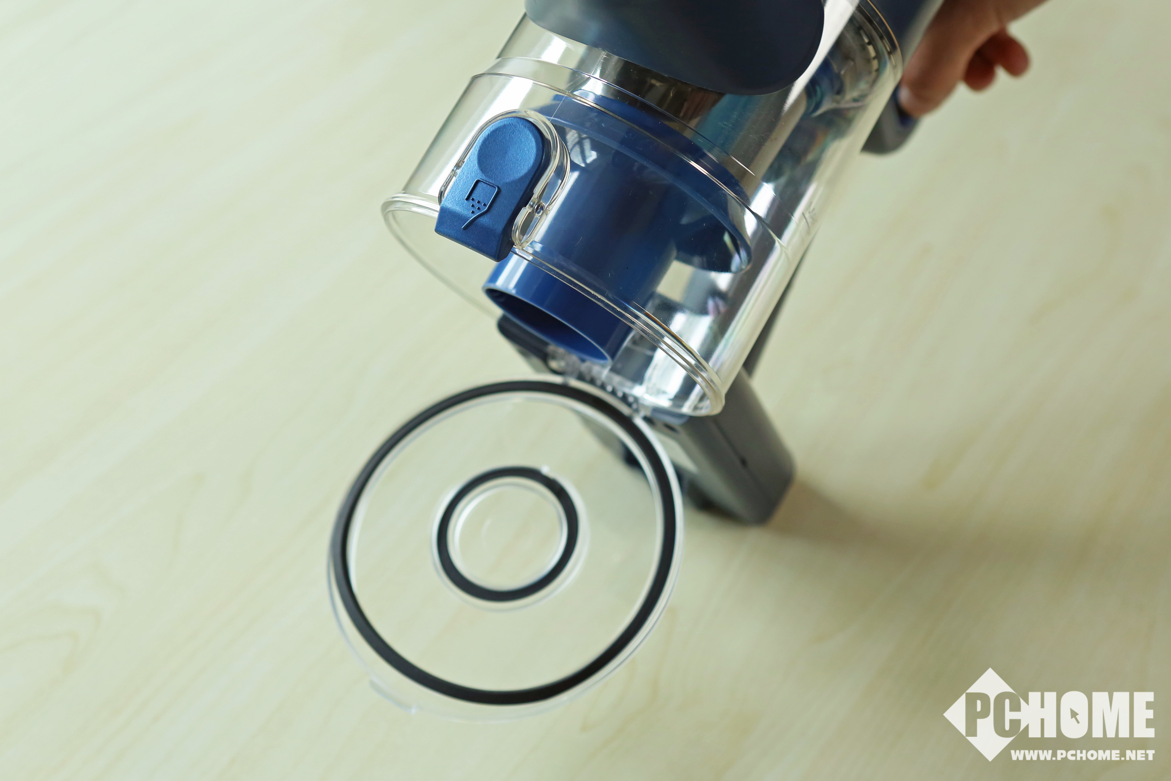 此外,倒出灰尘杂物也同样简单,按下尘杯底部锁扣,底盖打开,灰尘杂物就会直接掉出来,防止用户的手因清理吸尘器时变脏。