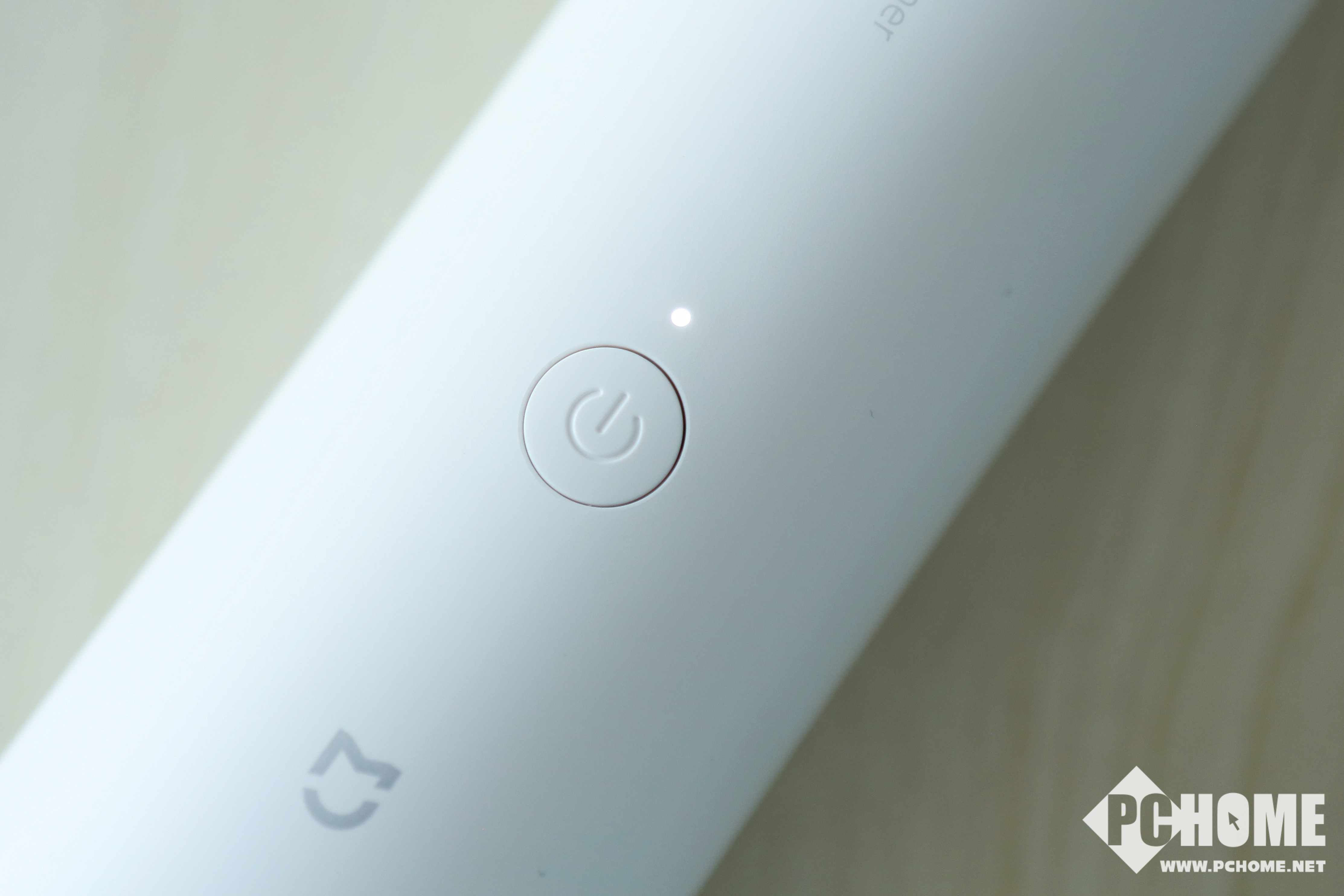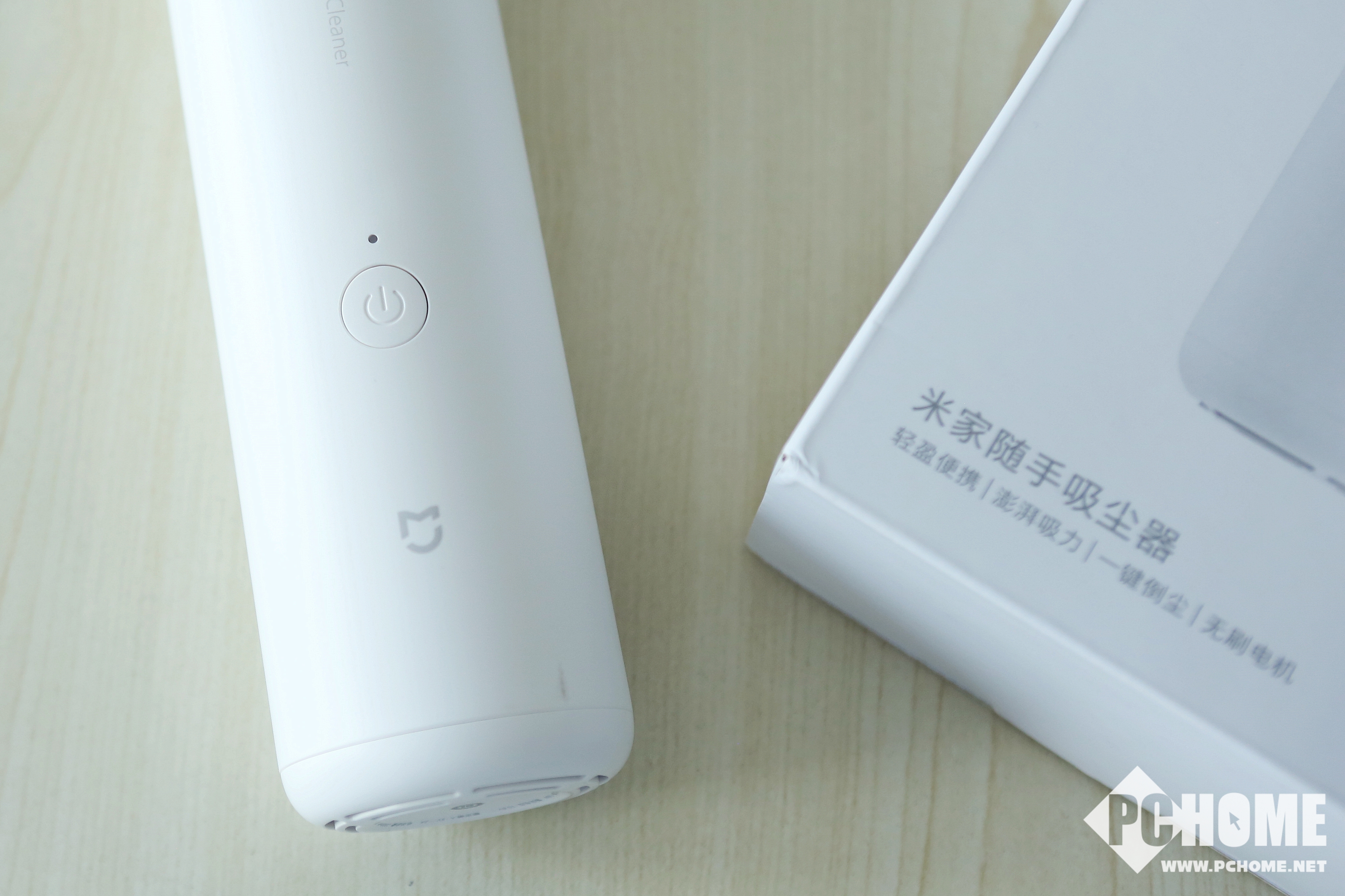 来看一下米家随手吸尘器的按键,米家随手吸尘器不仅外观简洁,按键操作也遵循极简设计。在机身下半部分有一个电源键,短按电源键可以依次循环切换,分别是开机(默认低档运行)、高档、关机。
