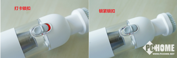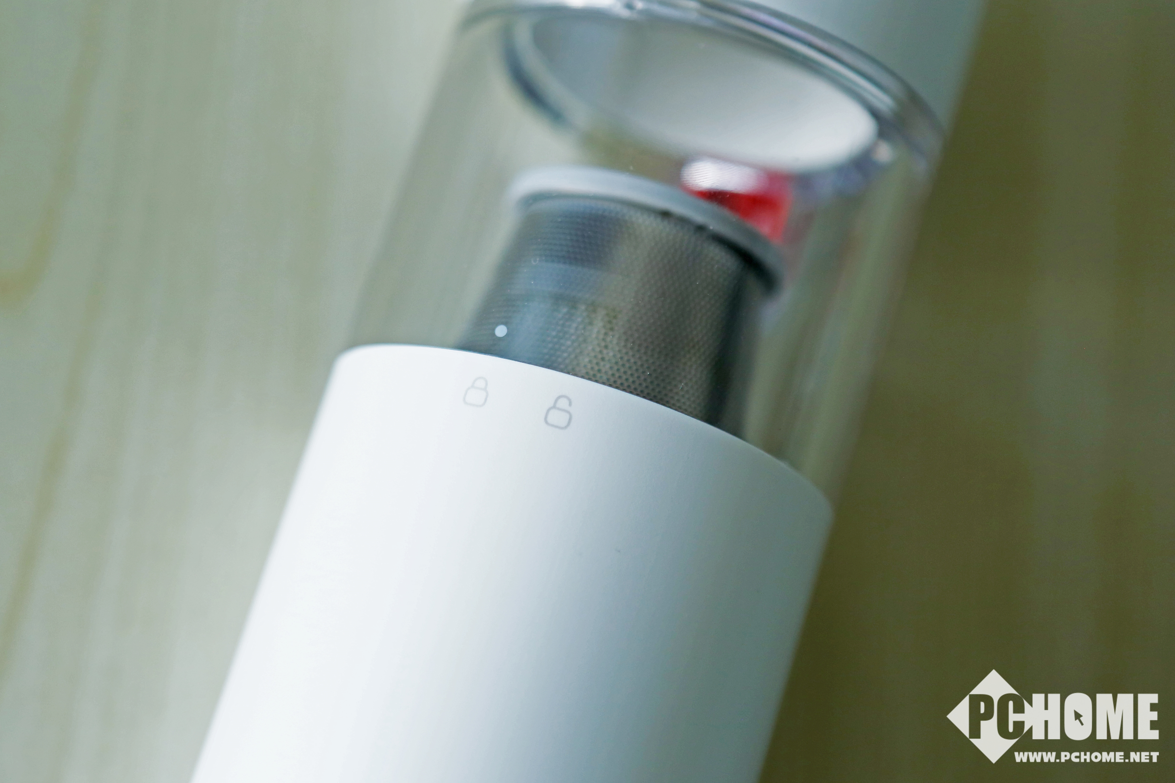 米家随手吸尘器的集尘杯采用按键锁扣的设计,清理起来比较方便。在倒尘时将按键锁扣下推后轻按,集尘杯盖弹开,就可以倒出垃圾。按键锁扣的设计不仅操作简单,而且可以固定杯盖,防止误触杯盖弹开。