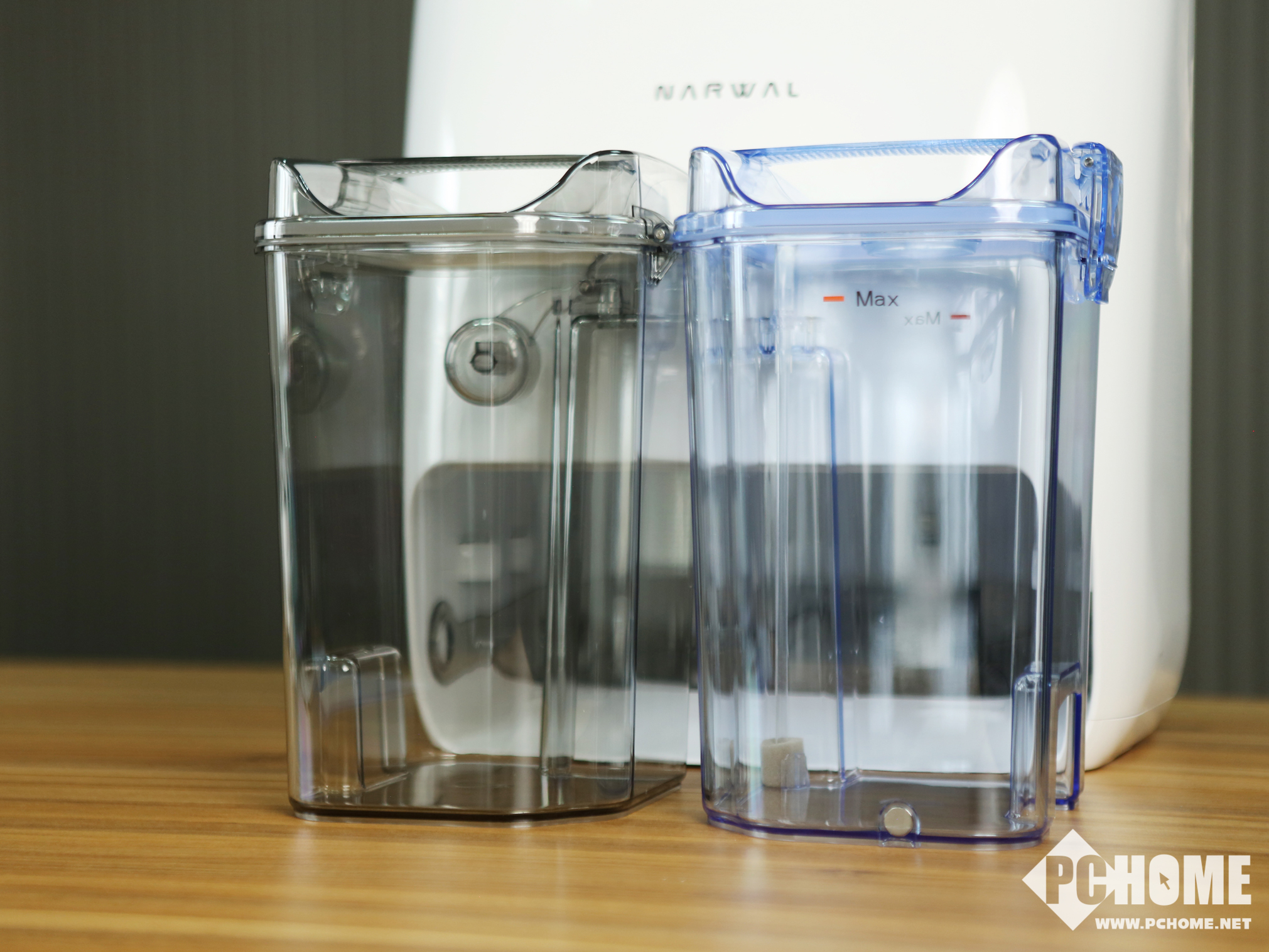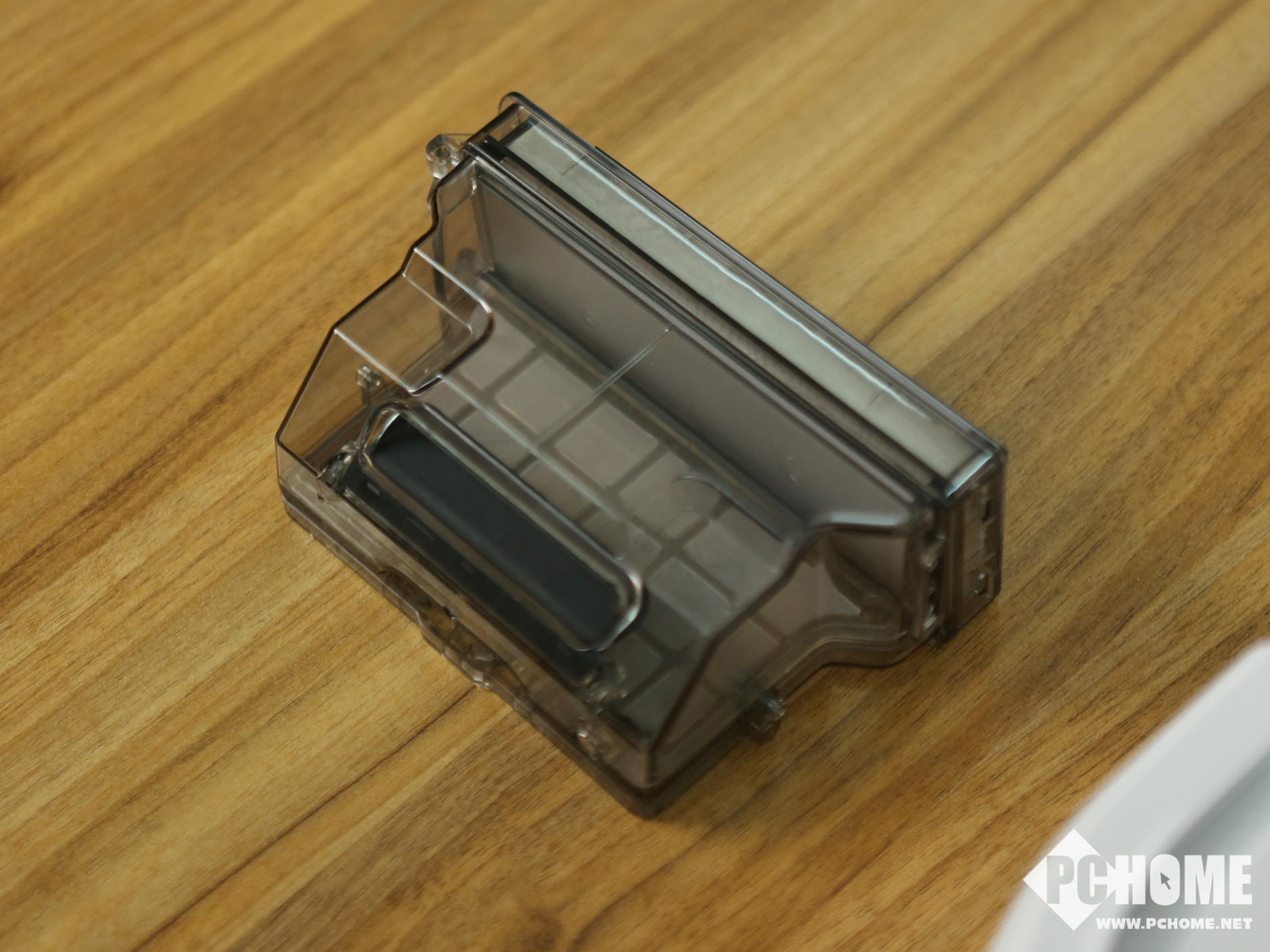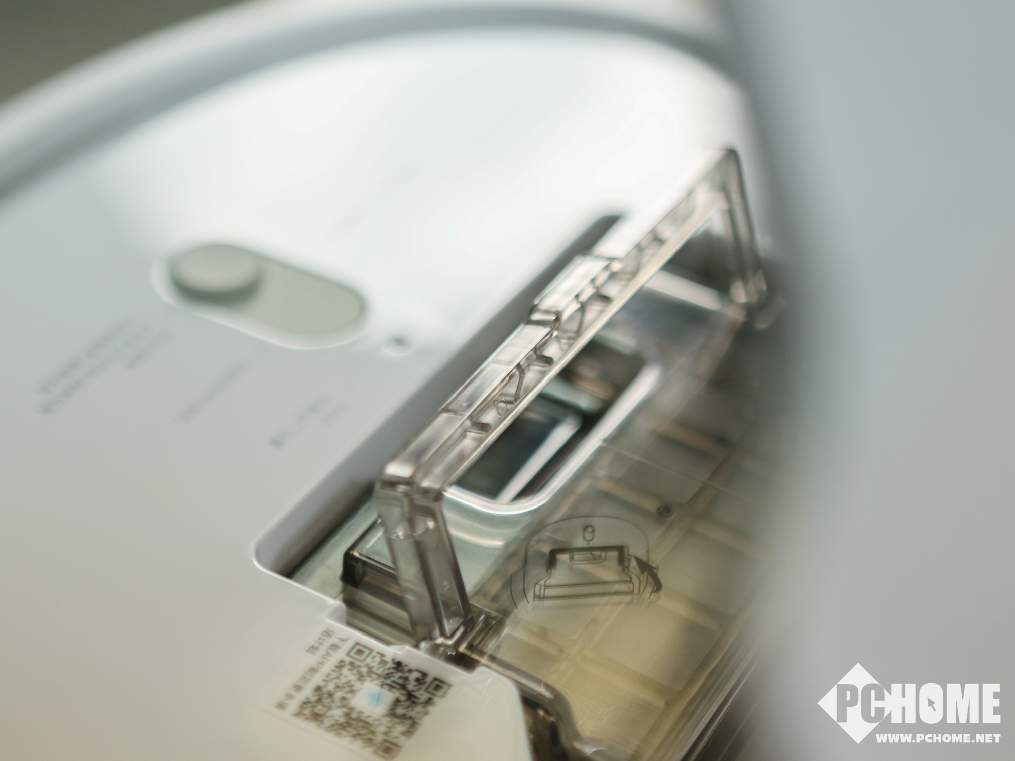 在尘盒的部分我们可以看到云鲸还是花了一些心思的,往常我们见到的扫地机器人尘盒都需要捏住卡扣取出,而「小白鲸」拖地机器人则是配置了一个提手,同时提手的两端也有凸起,可以与机身内部的轨道进行卡合,使得提出和放入的操作非常流畅自然。