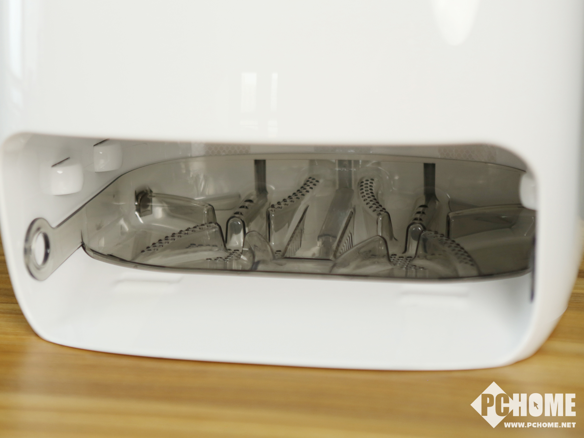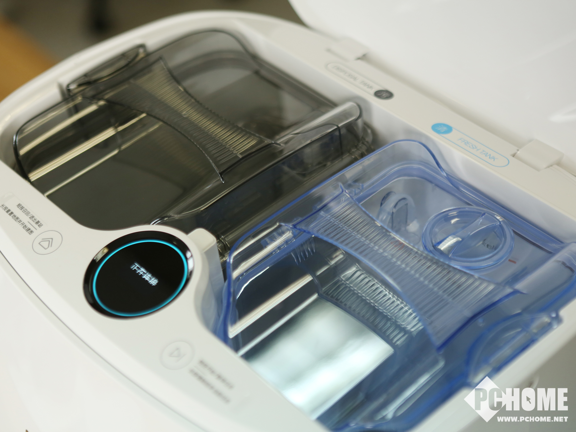 基站内部有两个水箱,分为净水和脏水,当系统检测到「小白鲸」拖地机器人的拖布脏到一定地步的时候就会进行回充清洁,这个时候净水水箱里的水就会渗出对拖布进行清洁,