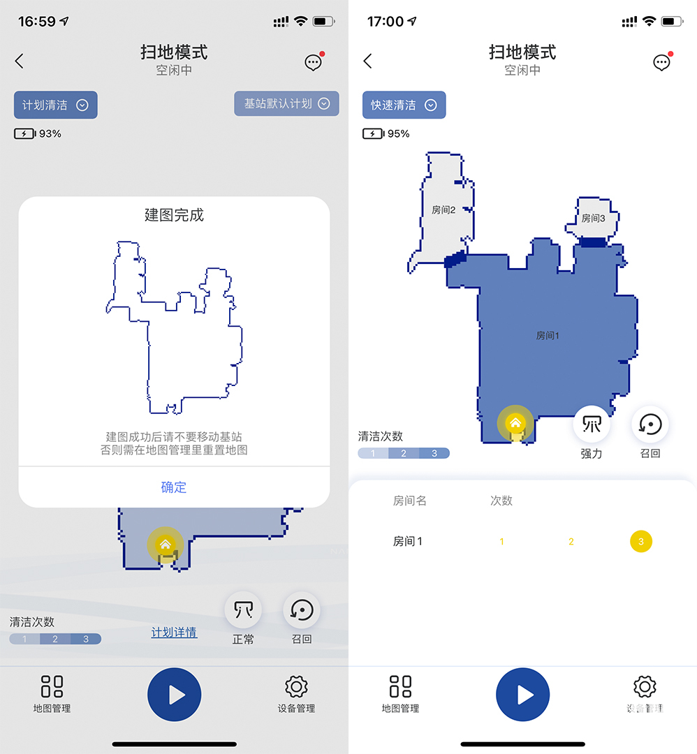 此外,在主页面上也可以对「小白鲸」拖地机器人的吸力状态进行调整,分为正常和强力两个选项,相对来说还是足够使用了。