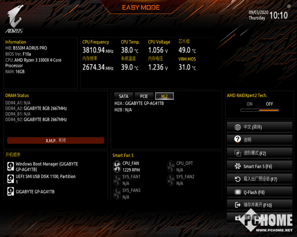 BIOS方面,技嘉在B550M AORUS PRO中使用了全新的界面,首页的简易模式下显示了包括CPU频率、内存信息、存储设备等在内的重要硬件信息,非常的直观。