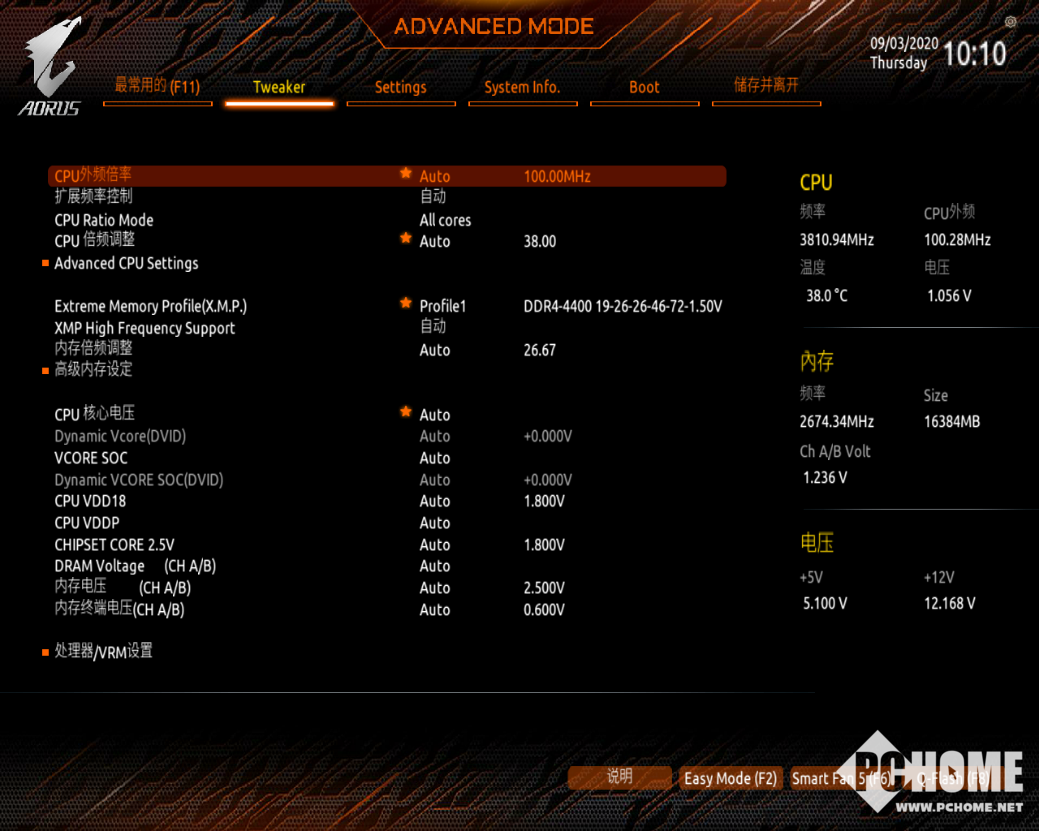 通过F2快捷键可以快速切换为高级模式,在这里进行CPU、内存等的超频操作也非常简单,例如本平台使用的AORUS RGB DDR4内存就内置了DDR4-4400的XMP文件,只需一键切换即可,对于高阶玩家来说,超频变得更简单。