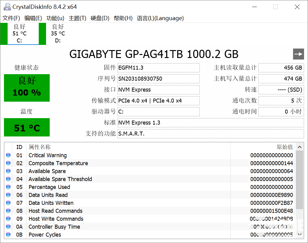 此次平台中我们使用的技嘉AORUS GEN4 SSD正是一款支持PCIe 4.0的高性能M.2 SSD,通过CrystalDiskInfo硬盘检测工具,可以看到这块硬盘采用PCIe 4.0 x4通道,并且支持NVMe 1.3协议。