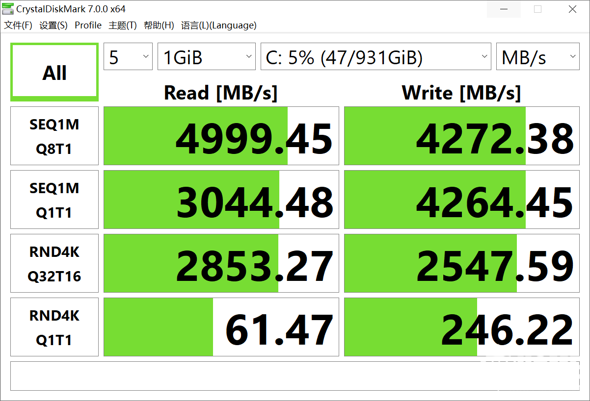 在CrystalDiskMark的测试中,实测最大连续读取速度高达4999.45 MB/s,写入4272.38 MB/s,表现惊人,4K随机读写速度方面,读取速度达到61.47 MB/s,写入高达246.22 MB/s,整体的性能表现非常惊艳,与目前主流的PCIe 3.0 SSD可以说是拉开了一大截差距。