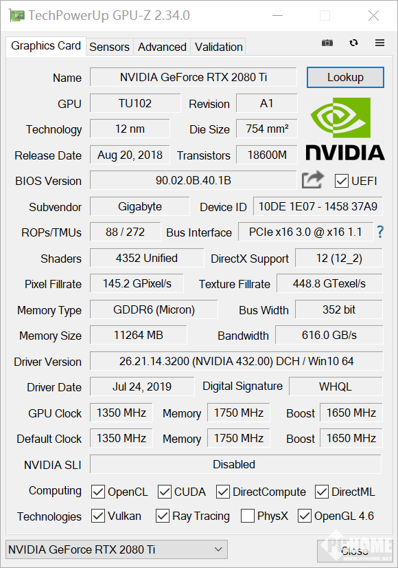 GPU方面,技嘉GeForce RTX 2080Ti GAMING OC 11G是RTX20系列中的旗舰,该卡采用NVIDIA图灵TU102核心,使用12纳米工艺制程,包含4352个CUDA核心,核心频率高达1750MHz。同时使用了352bit的11GB GDDR6显存,配备3个DP接口、1个HDMI以及一个USB Type-C接口,最大输出分辨率达7860*3840。