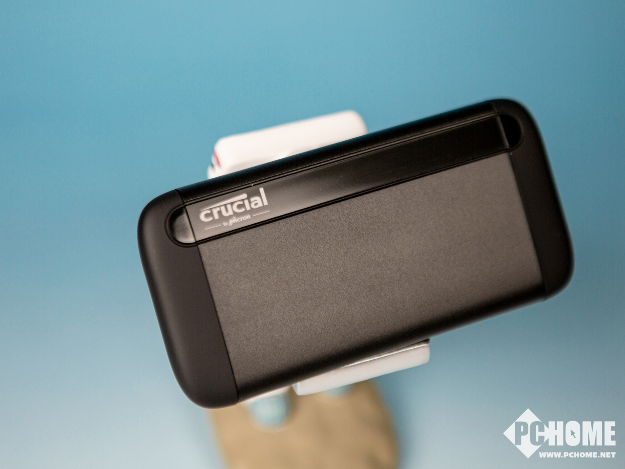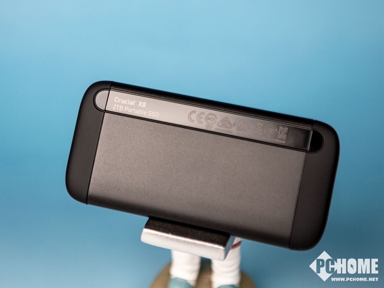Crucial X8移动固态硬盘2TB版采用了坚固耐用的铝合金外壳,表面经过磨砂处理,质感与做工处理的都比较优秀。两侧的硅胶材质可以起到导热作用,而右侧的装饰条印有品牌名称和产品标识,表面为钢琴烤漆亮面,和装饰条形成了反差,提升了质感。